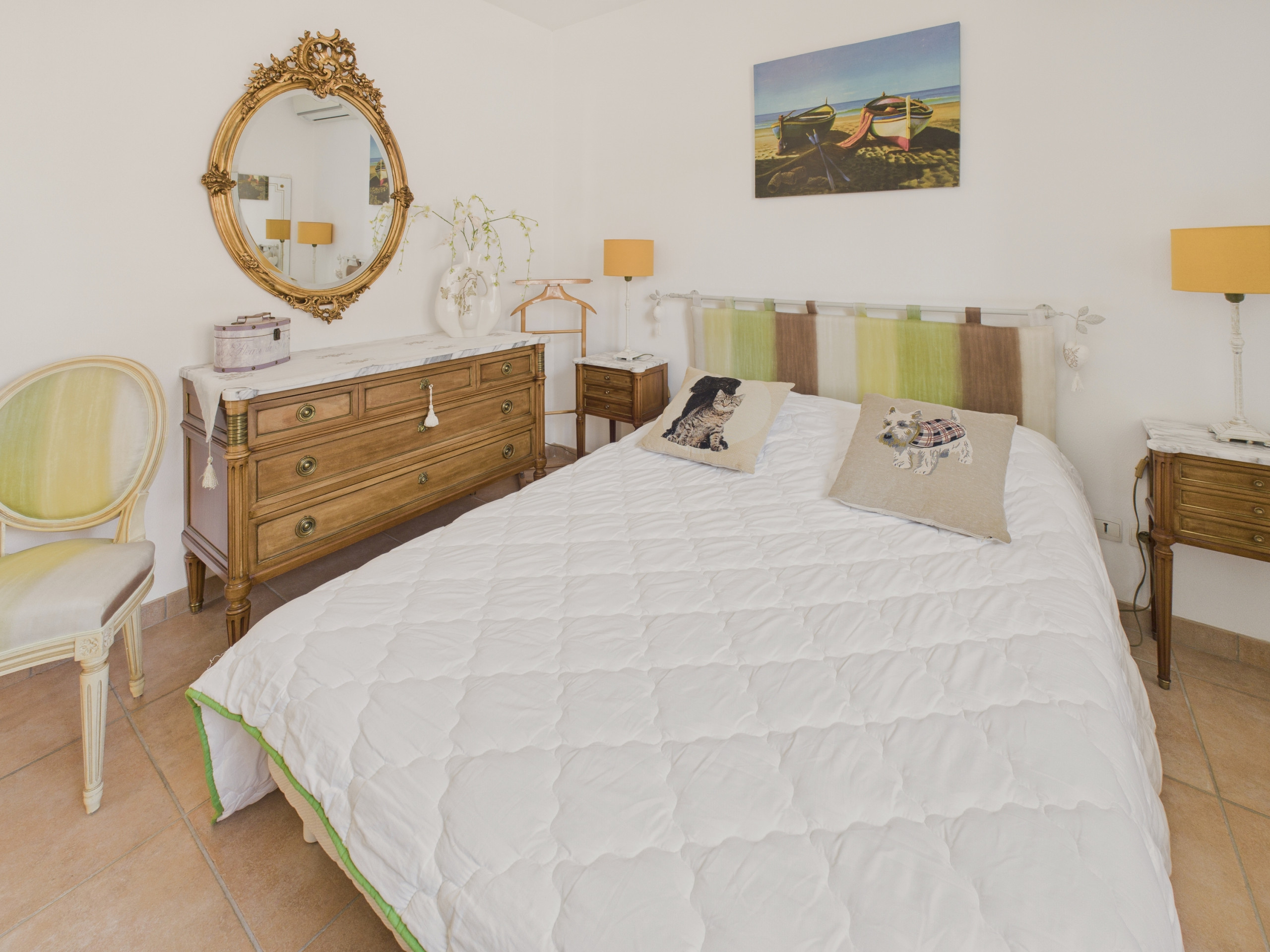 The villa also includes two bedrooms. The first, open to the garden, has a double bed, parquet flooring, and a wooden ceiling, creating a "cabin" atmosphere conducive to tranquillity and rest. The second bedroom, with its two single beds, evokes the seaside with its blue tones.