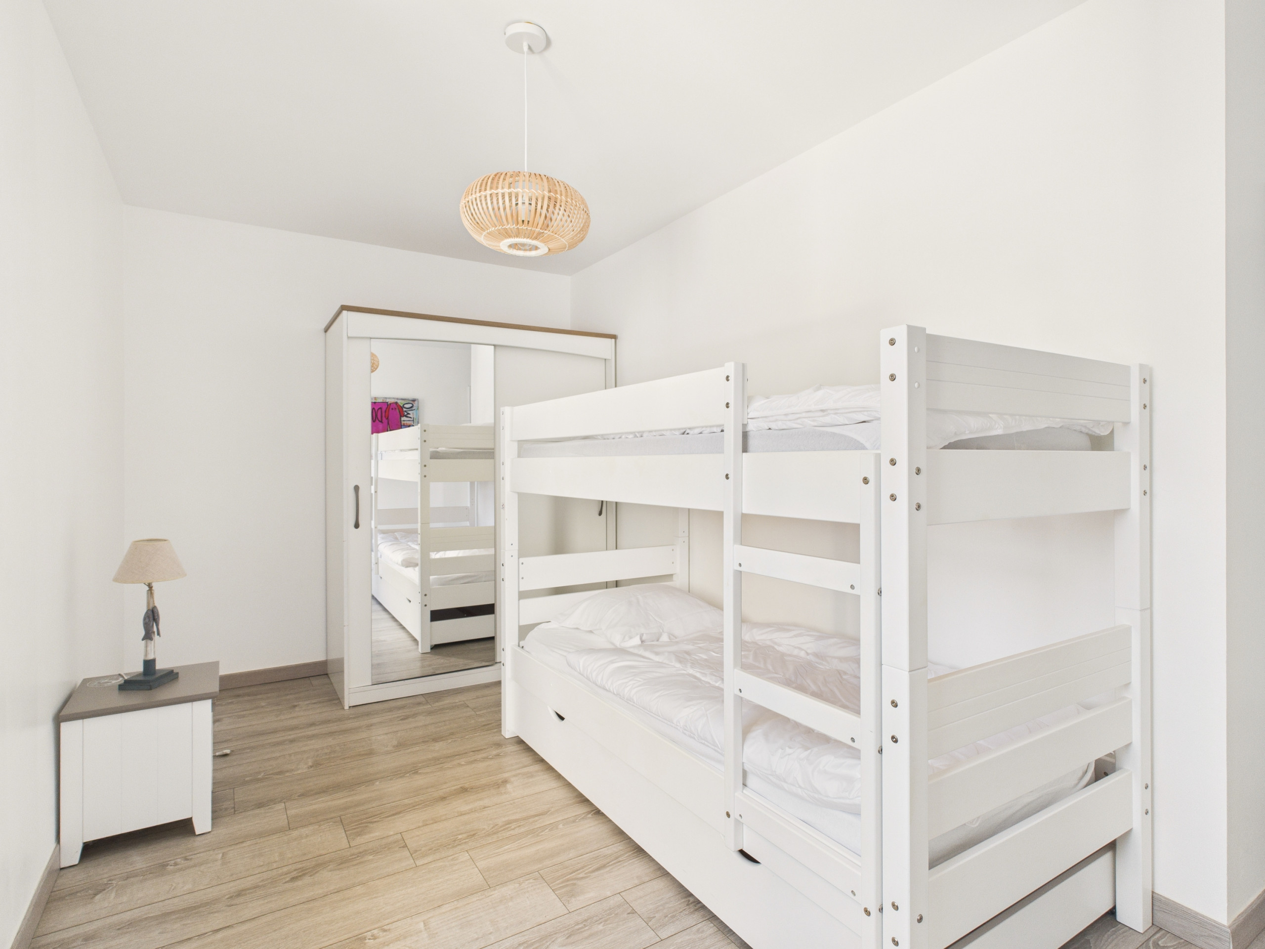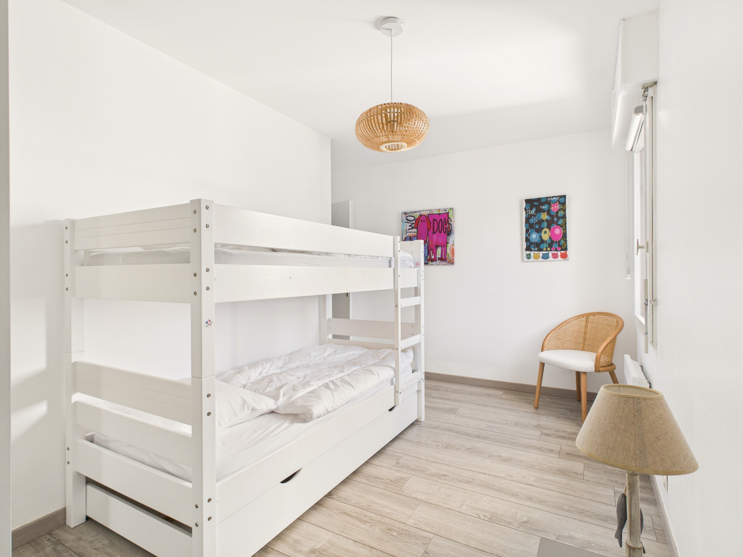 Upstairs, the sleeping area consists of three comfortable bedrooms. The first has a Queen Size bed (160x200), the second a double bed (140x190), and the third is perfect for children with its bunk beds (90x190). A bathroom with shower completes the floor. For added convenience, a laundry room with a second shower is also available on the ground floor: ideal for returning from the beach!