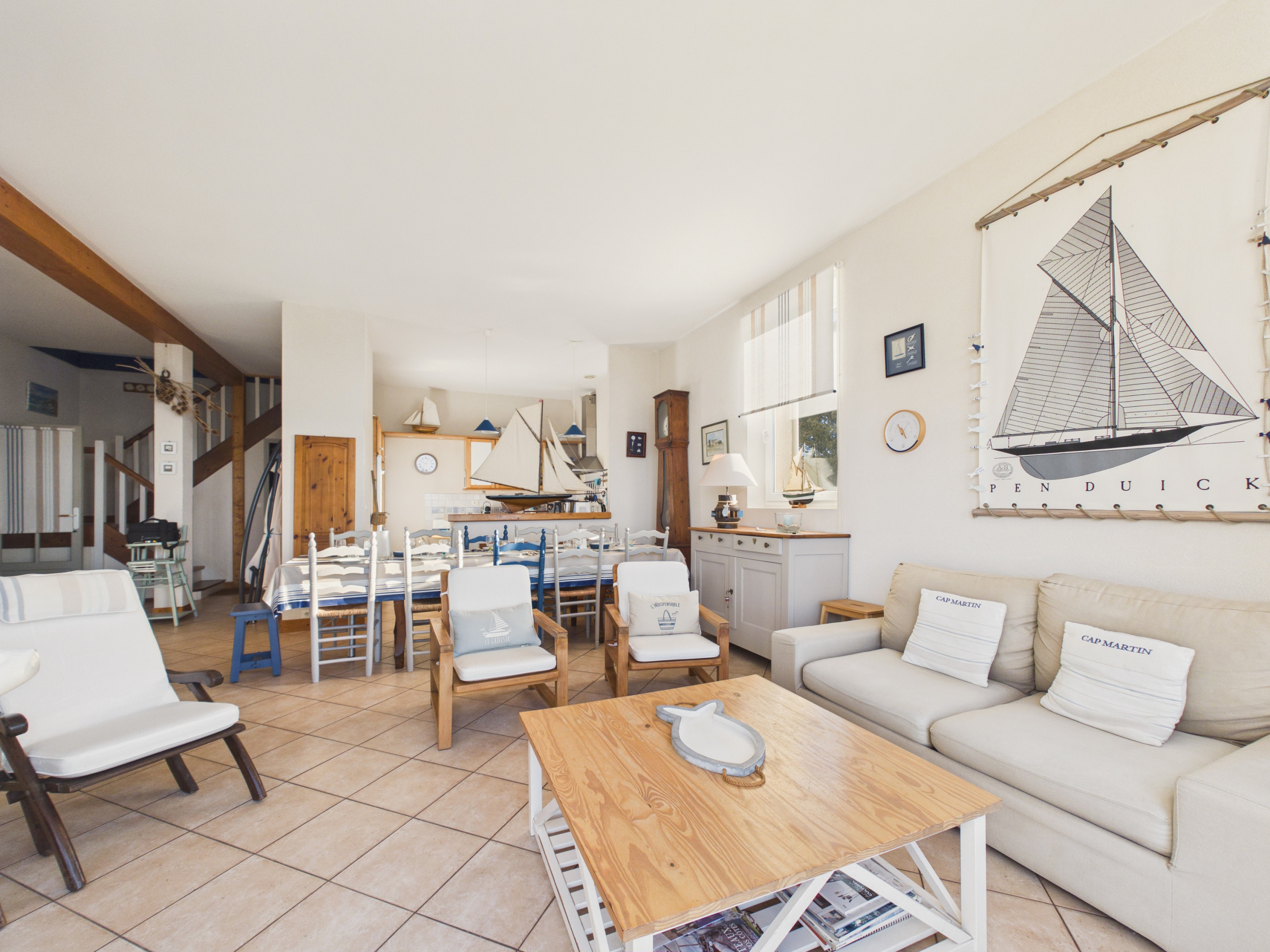 Upon your arrival in this house, you will discover its large, bright living area with the lounge corner and its sea view, as well as the friendly dining table right next to it. You will also have access to the fully equipped kitchen: it has gas hobs, an oven, a microwave, a food processor, a toaster, a kettle, a filter coffee machine and a Krups coffee maker.
