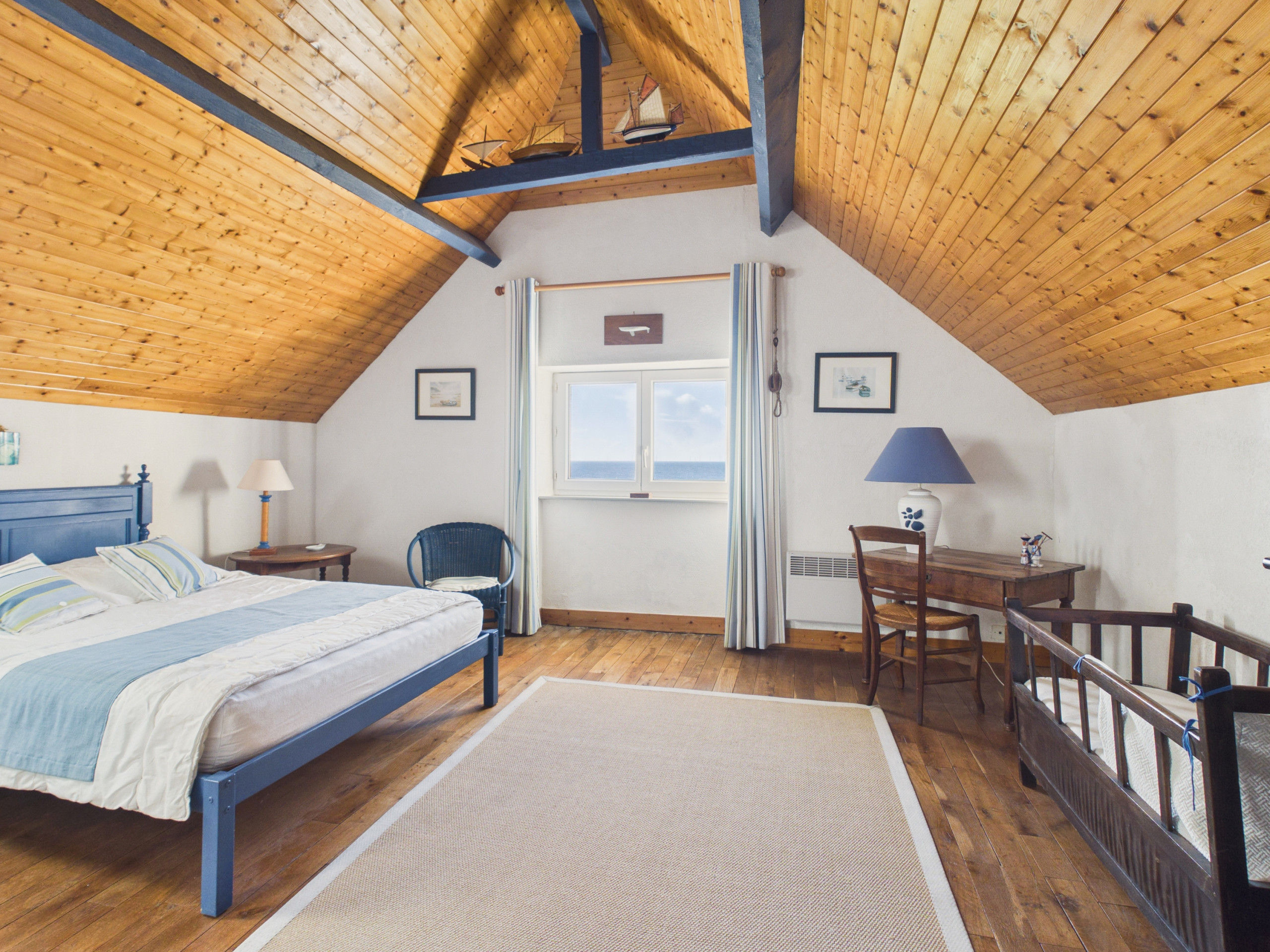 Bedroom 5 (master suite): upstairs: has a double bed (140/190), a wooden baby bed and a bathroom.