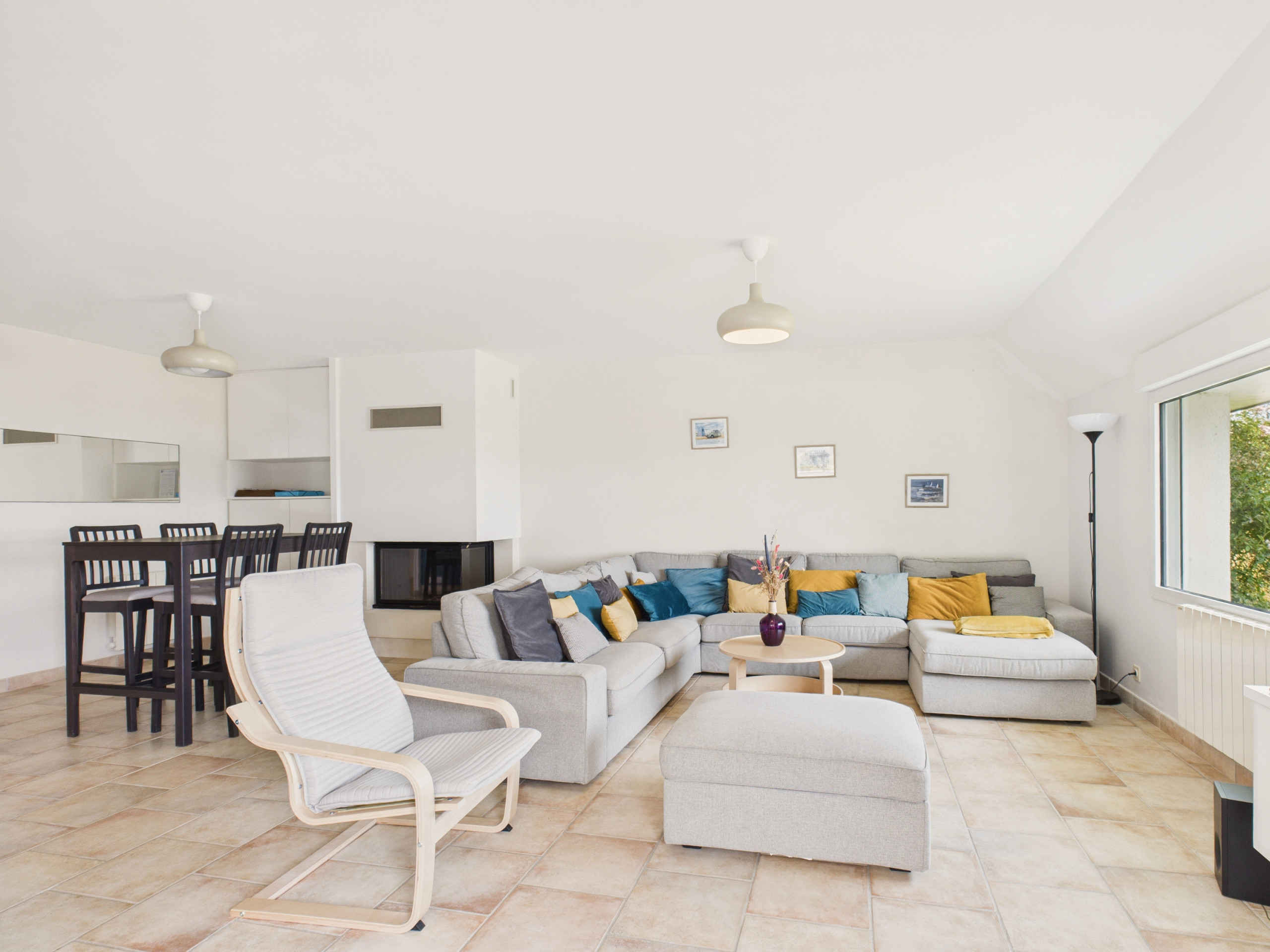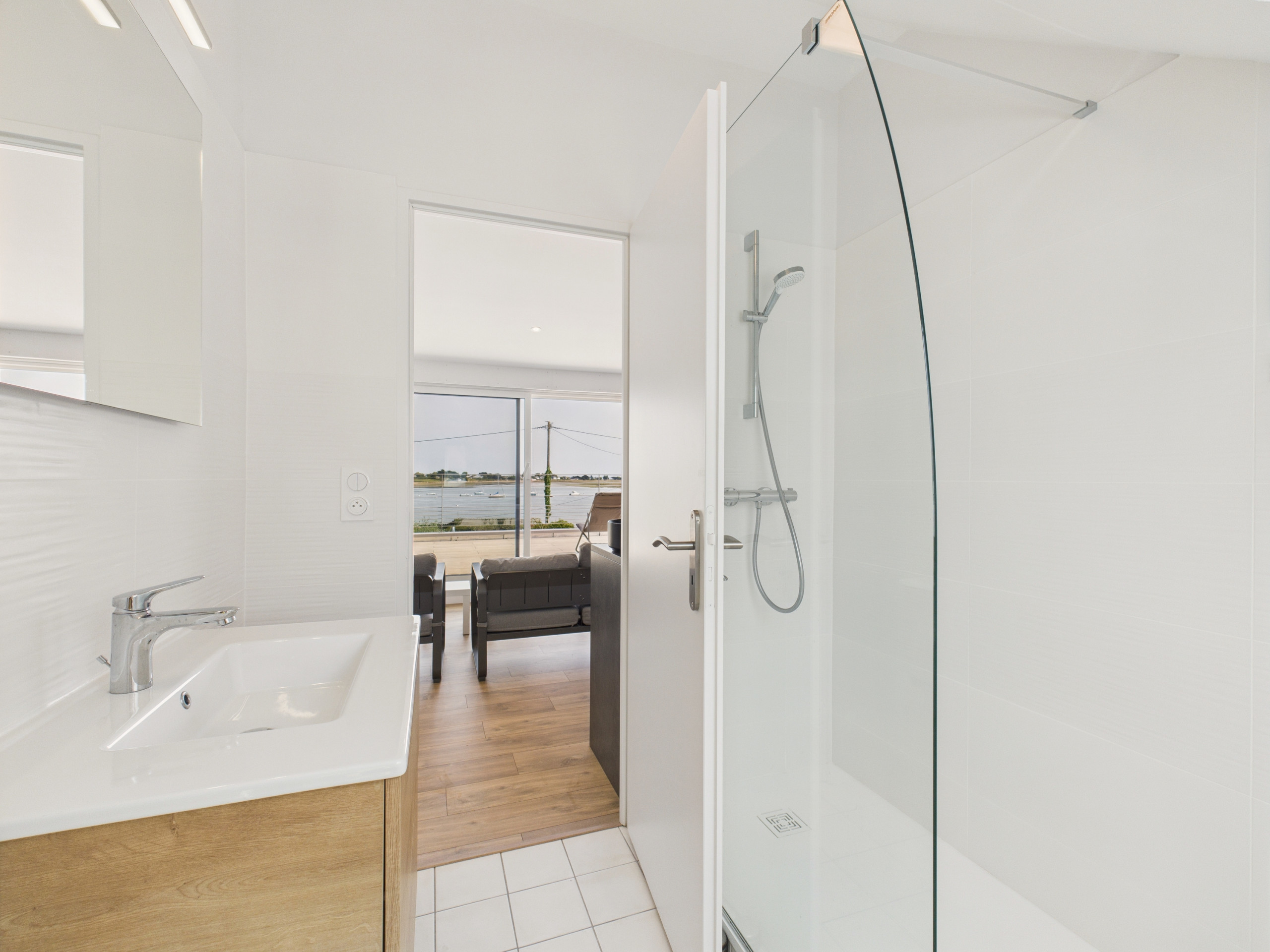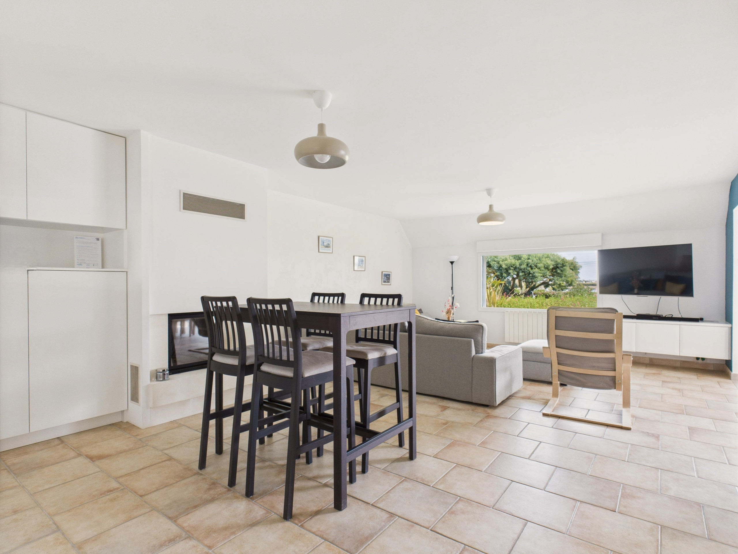 Enter through the entrance door and discover a bright, spacious living area with access to the terrace, offering a magnificent sea view. The independent, fully equipped kitchen (refrigerator, freezer, oven, microwave, dishwasher) allows you to cook as if you were at home. For breakfast, a kettle, toaster, and filter coffee maker are at your disposal. Share your meals around the large indoor dining table or enjoy the one on the terrace on sunny days. In the evening, gather in the living room, comfortably seated on the sofas facing the television, always with this superb view of the boats. A soundbar, a Samsung speaker, and board games are also available.