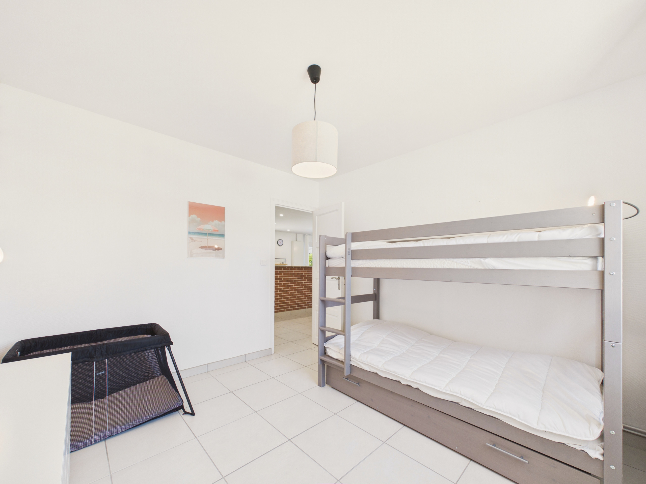 The house can accommodate up to 8 people, perfect for a family stay. It has 3 bedrooms. On the ground floor, the first bedroom is equipped with a queen-size bed, its natural tones offer you an ideal ambiance for a good night's rest. Then, upstairs, you will find two other bedrooms. The first also has a queen-size bed and a soothing atmosphere, and the last will delight children with its 2 single beds and trundle bed. A bathroom with toilet is available on the ground floor, and upstairs a bathroom with bathtub and walk-in shower.