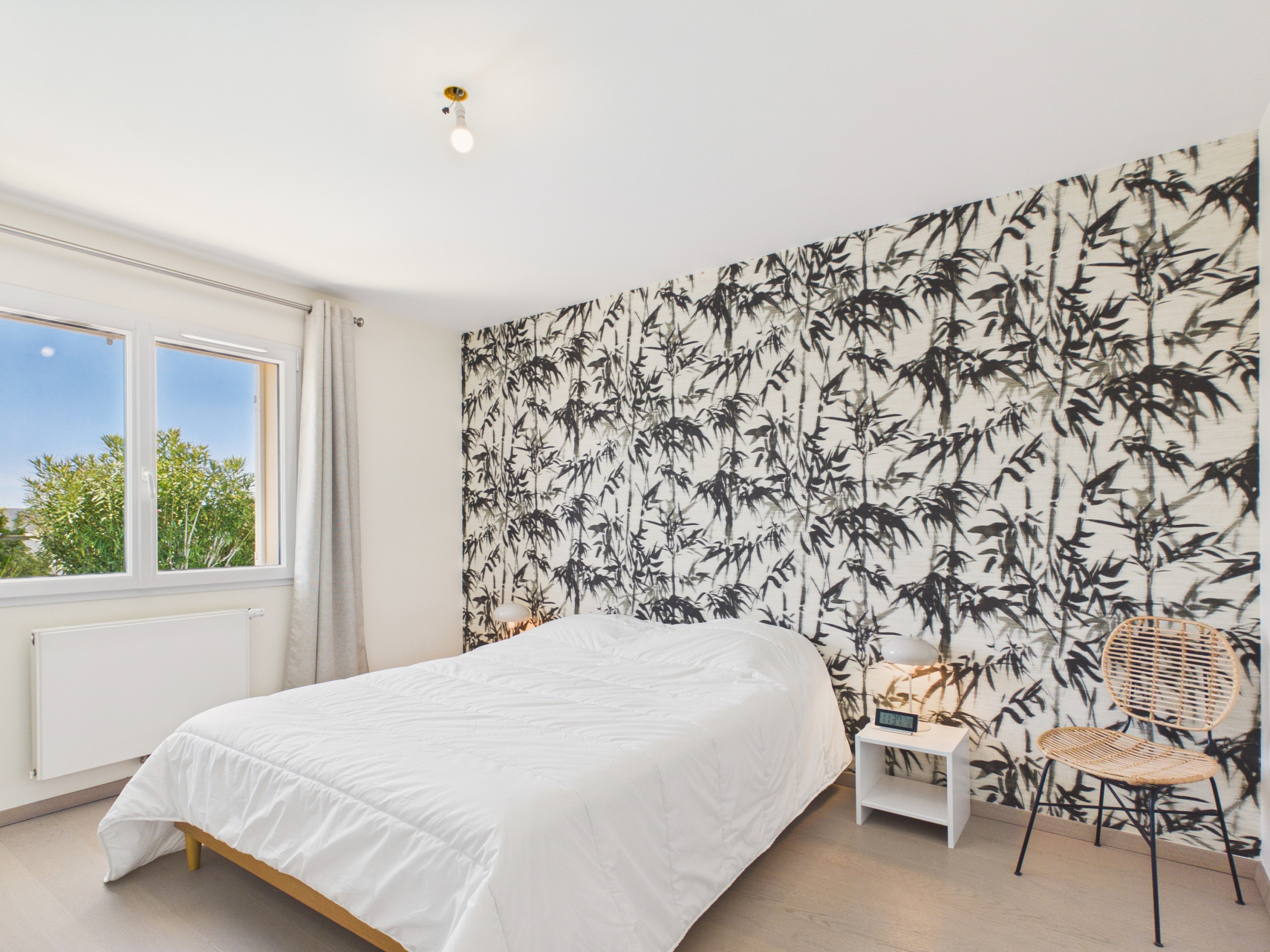 The living area welcomes you with its pastel tones and minimalist decor, making it a soothing space. You will find a fully equipped and modern kitchen, with induction hobs, a refrigerator, a freezer, a microwave, an oven, a dishwasher, a coffee maker, a toaster and a kettle. You can thus enjoy delicious meals around the wooden dining table. You will also have the opportunity to enjoy a movie night in complete privacy in the separate living room.