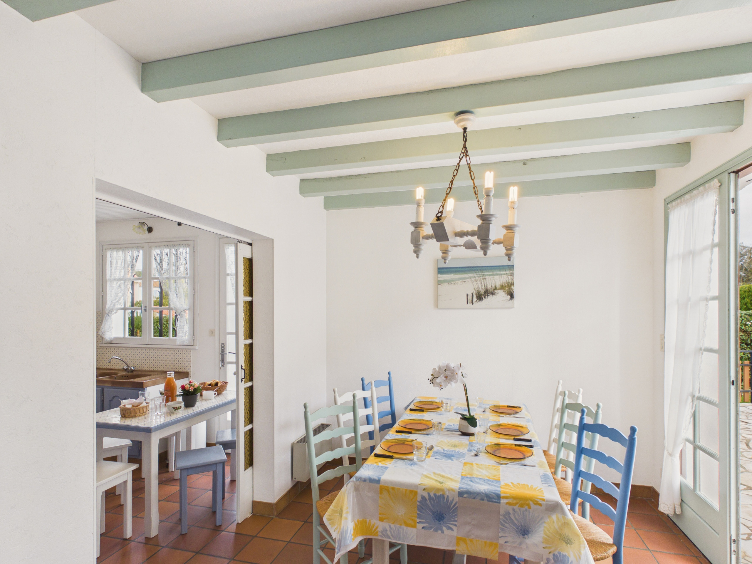 Inside, you enter a friendly living room consisting of a lounge area with a sofa, two armchairs and a television, perfect for your moments of relaxation. On the other side, a table that can accommodate up to 6 people will allow you to share warm meals with family or friends. The open kitchen, located just next door and also featuring a second table perfect for gathering around breakfast, is fully equipped: ceramic hobs, refrigerator, freezer, oven, microwave, dishwasher, filter coffee maker, toaster and everything necessary to cook comfortably during your stay.