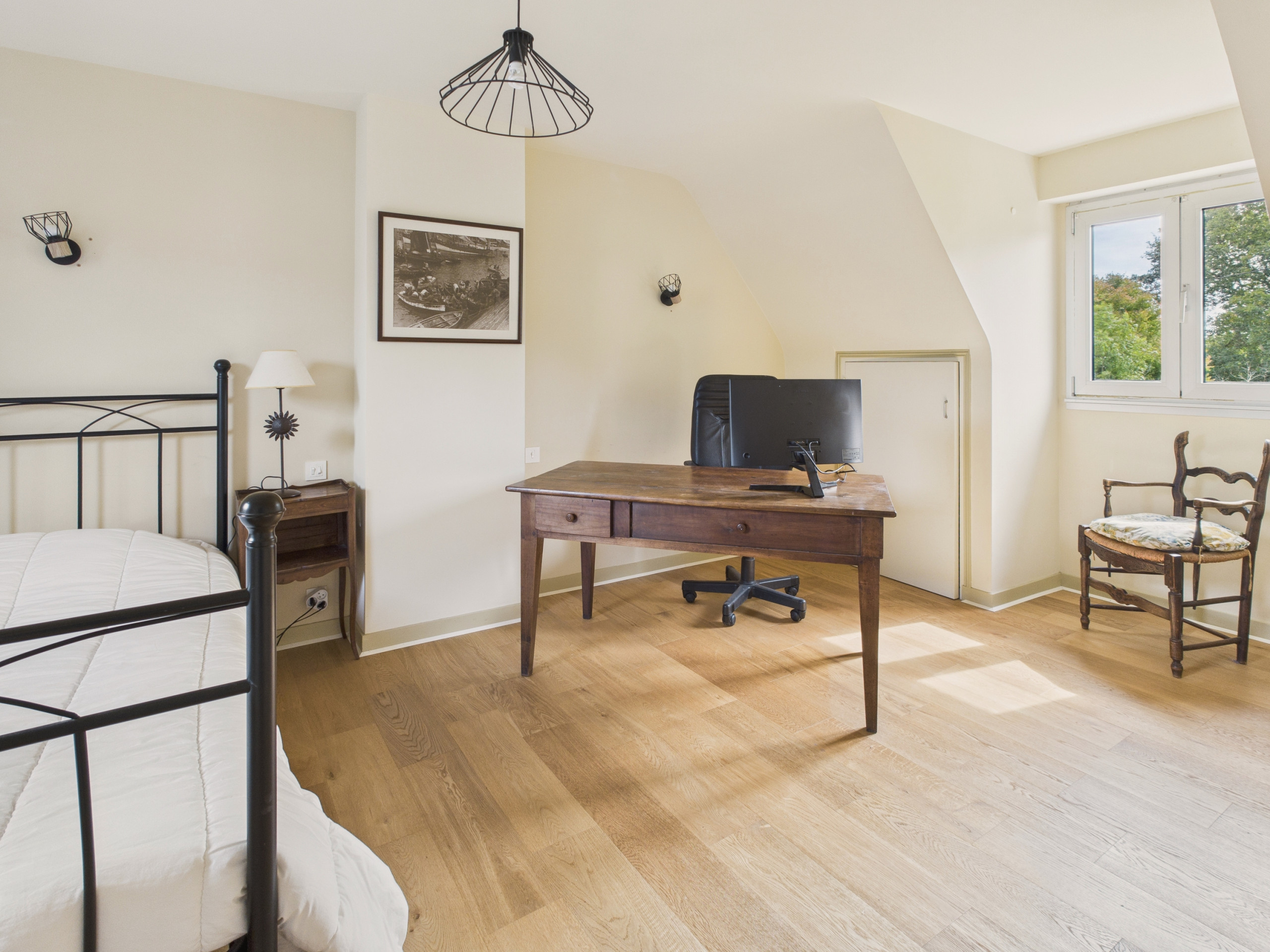 The rooms are located on the floor which is divided into 2 parts. The first three are accessible by the entrance staircase, the first has a Queen Size bed (160x200cm) and a desk, the second has a double bed (140x190cm) and the third has two single beds (90x190cm). On the other side, a fourth room with a Queen Size bed (160x200cm) and a single bed (90x190cm) is accessible via the garage staircase. As well as a fifth room with a double bed (140x190cm) and its adjoining bathroom with WC accessible via an exterior staircase.
