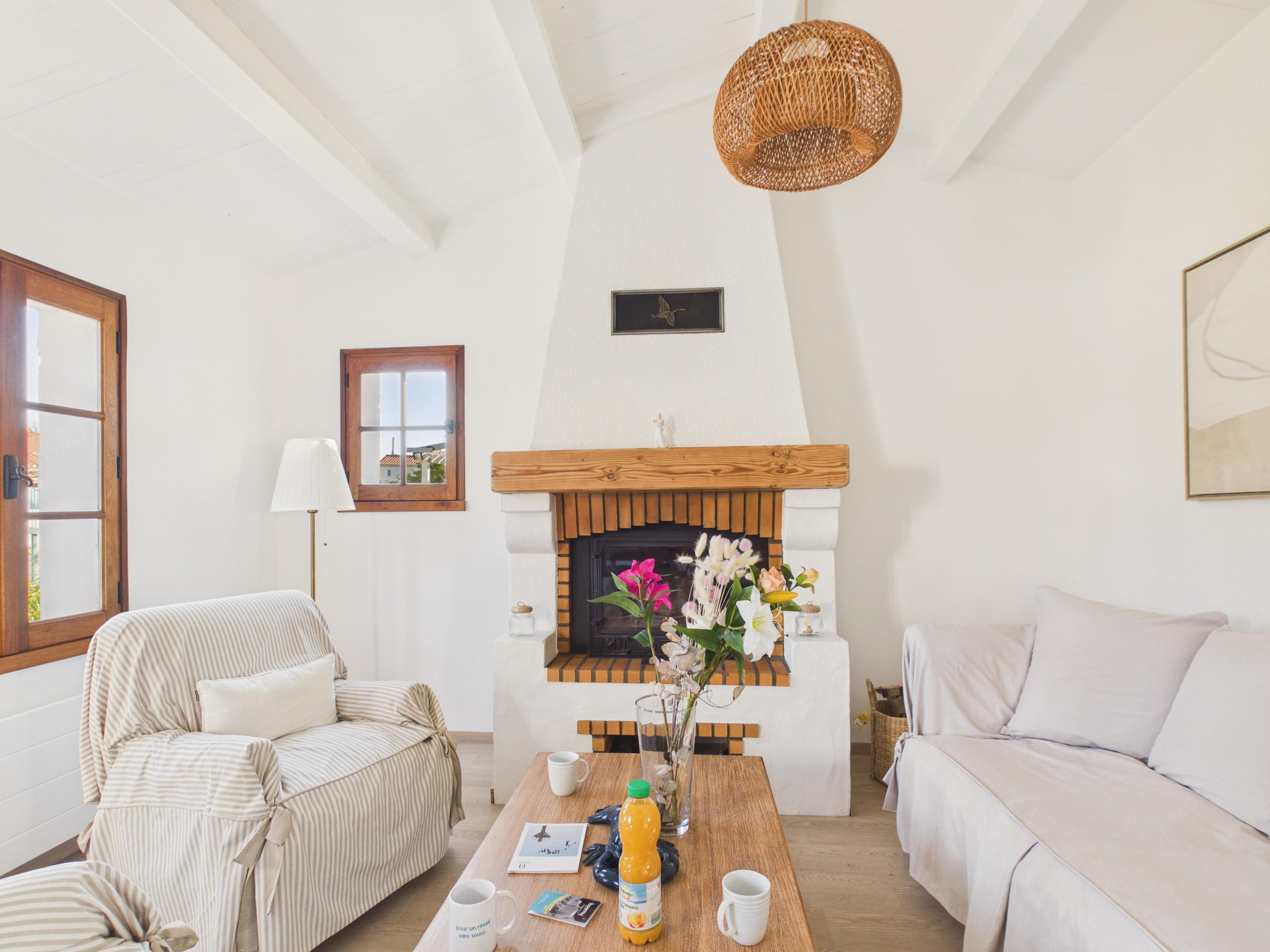 Upon arrival at the house, you will discover the bright living room with its lounge area with sofas and its lovely decorative fireplace. Just behind is the dining table with a view of the garden. You will also discover the fully equipped open kitchen, it has everything you need to cook with an oven, a microwave, a kettle, a dishwasher, a toaster, a Senseo coffee maker, and all the utensils you may need.