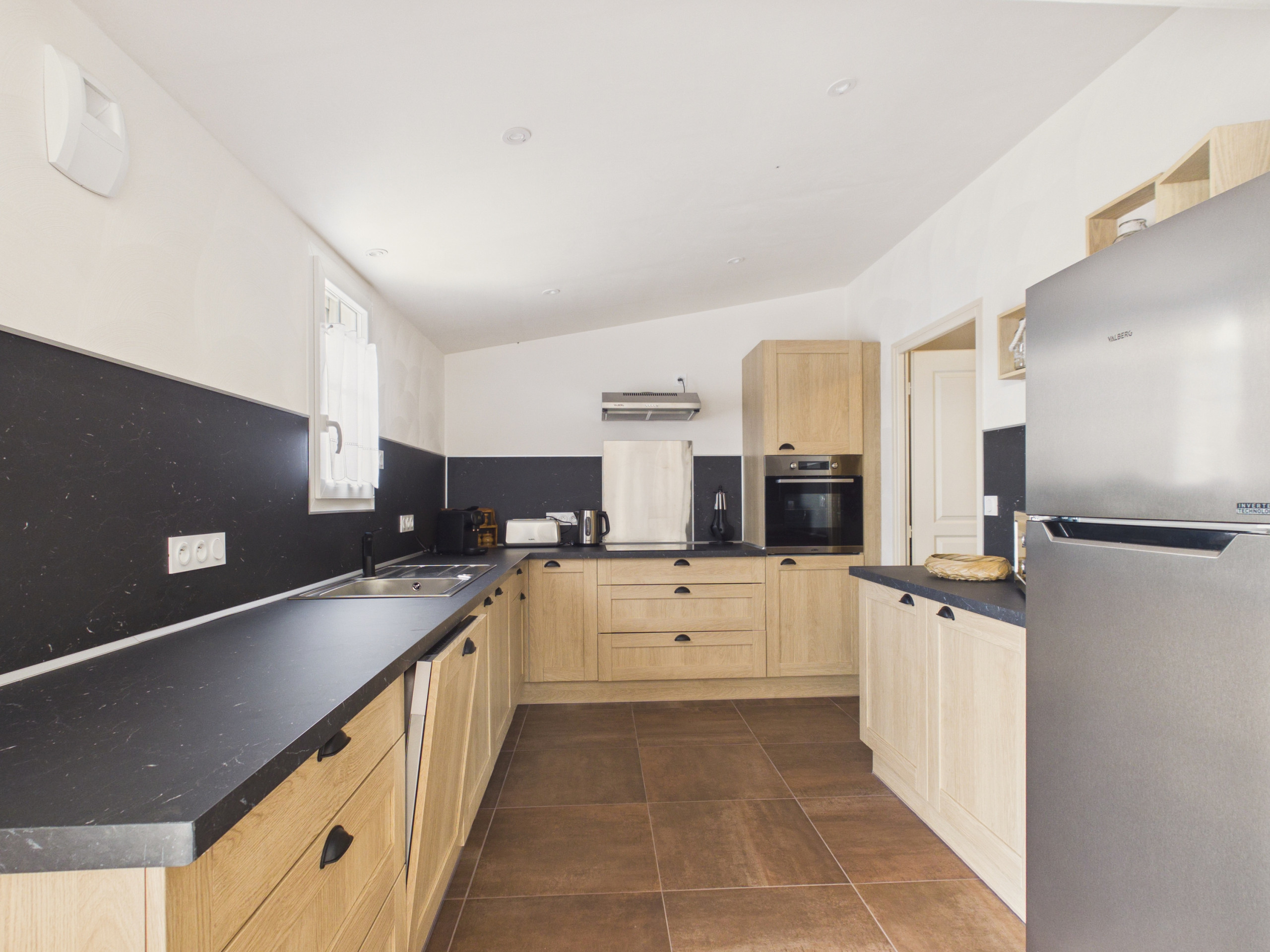 Inside, you will discover a beautiful, bright living space as soon as you enter. The living room is furnished with a large, comfortable corner sofa and a television, perfect for relaxing after a day of exploring the island. The large bay window offers direct access to the terrace and garden, bringing beautiful brightness to the whole space. The dining area, located in the extension, has a large table that can accommodate up to 8 guests. The open, modern and functional American kitchen is fully equipped: induction hobs, fridge/freezer, oven, microwave, dishwasher, Nespresso coffee machine, toaster, kettle and all the necessary utensils to cook as if at home.