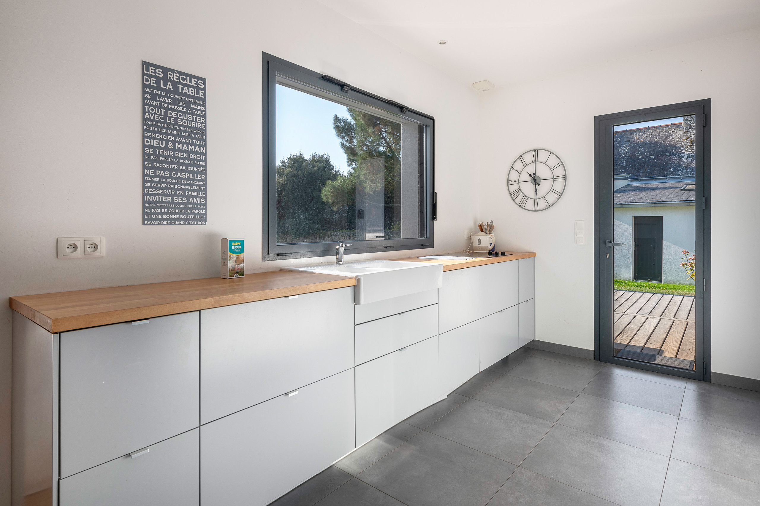 In this house, you will find a large main living room with a living area, a sofa, a television and direct access to the garden through large bay windows offering a beautiful view of the outside. Just behind, are the dining table and the open kitchen.