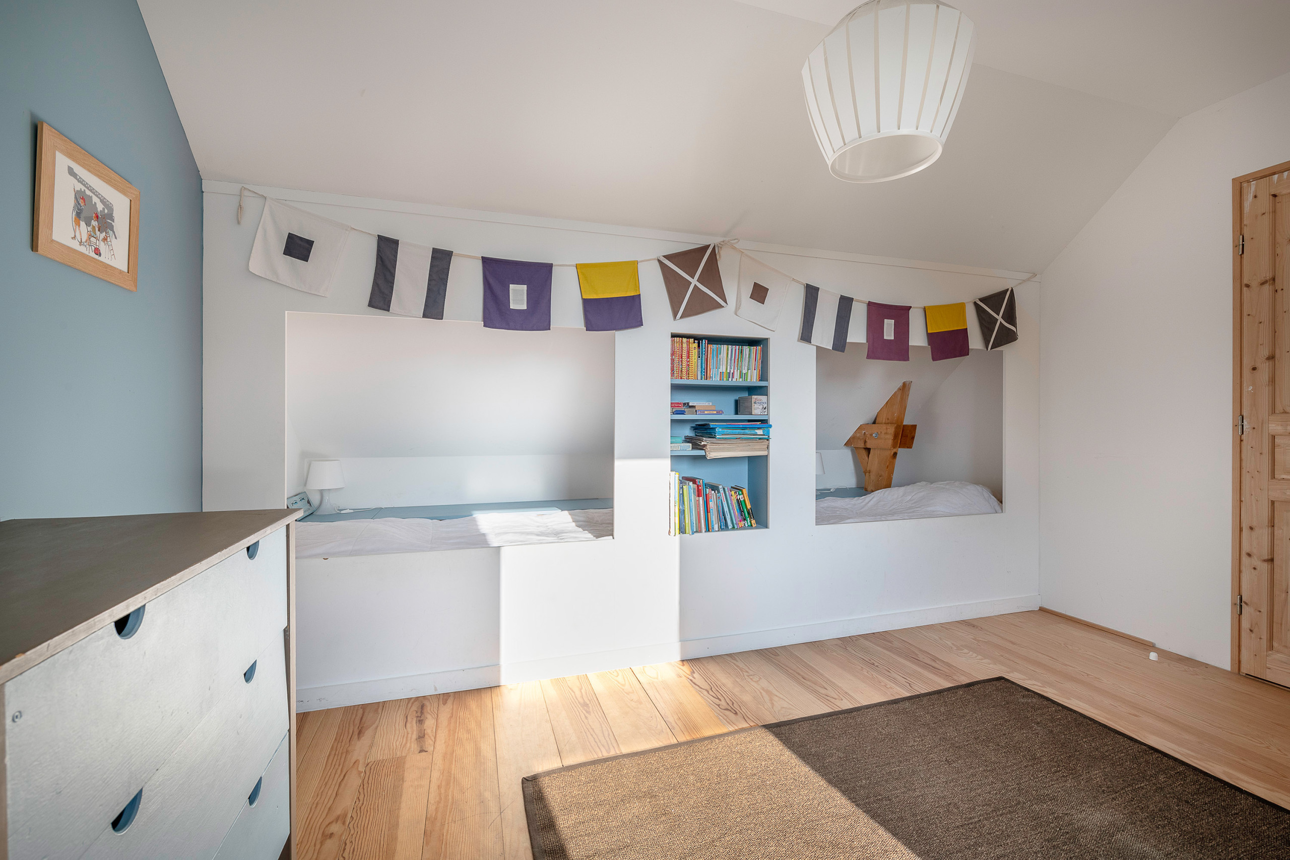 Two rooms for adults each offer a double bed (140x190). For children, a first room with two beds in a boat cabin invites young sailors on board. In the second, they will take their quarters in a bunk bed. Each of these two rooms offers a beautiful space to play.