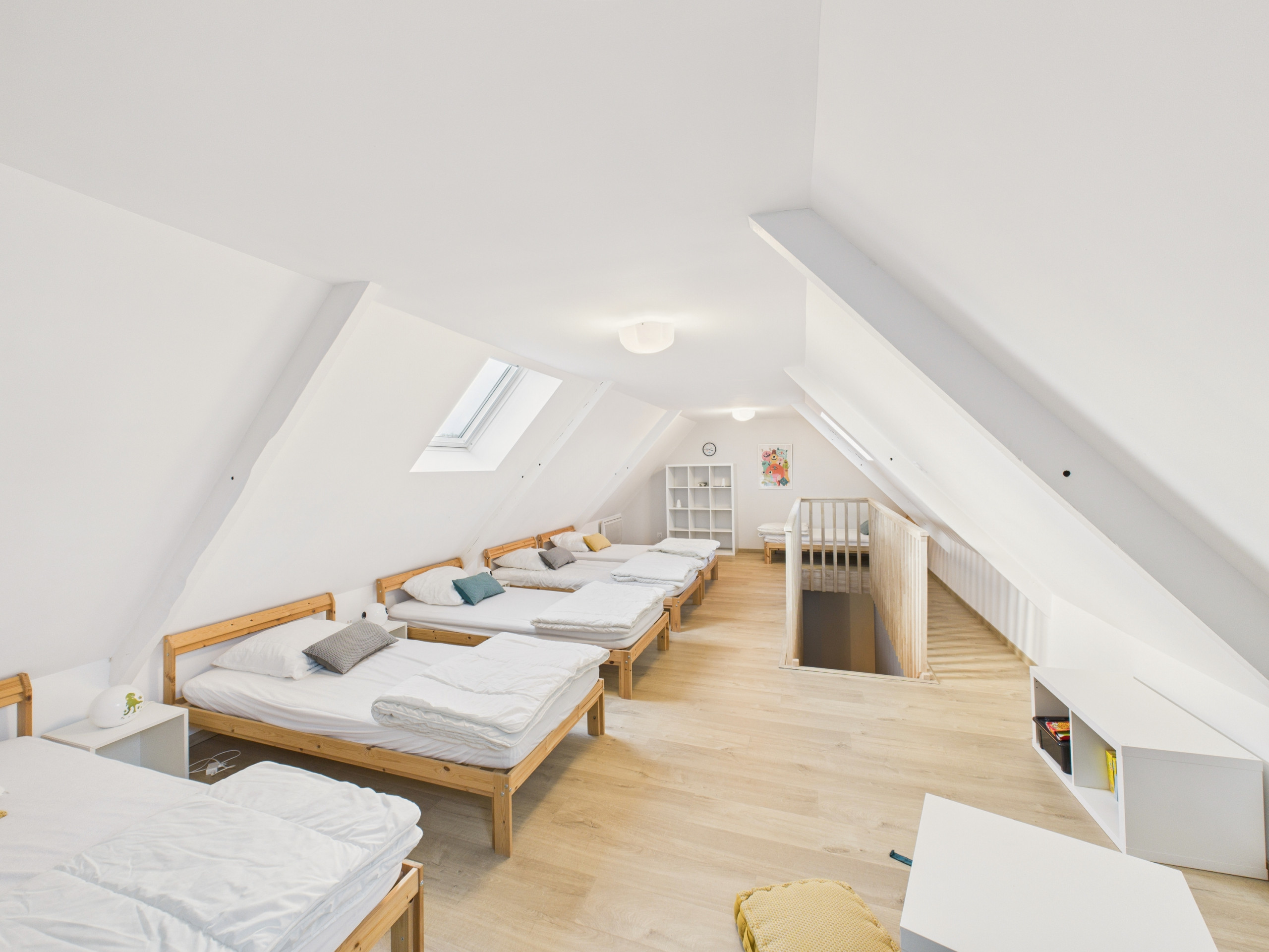 Bedroom 3 – 2nd floor: a large dormitory of 40 m² with 6 single beds (90 x 190 cm), a bathroom and private toilets.