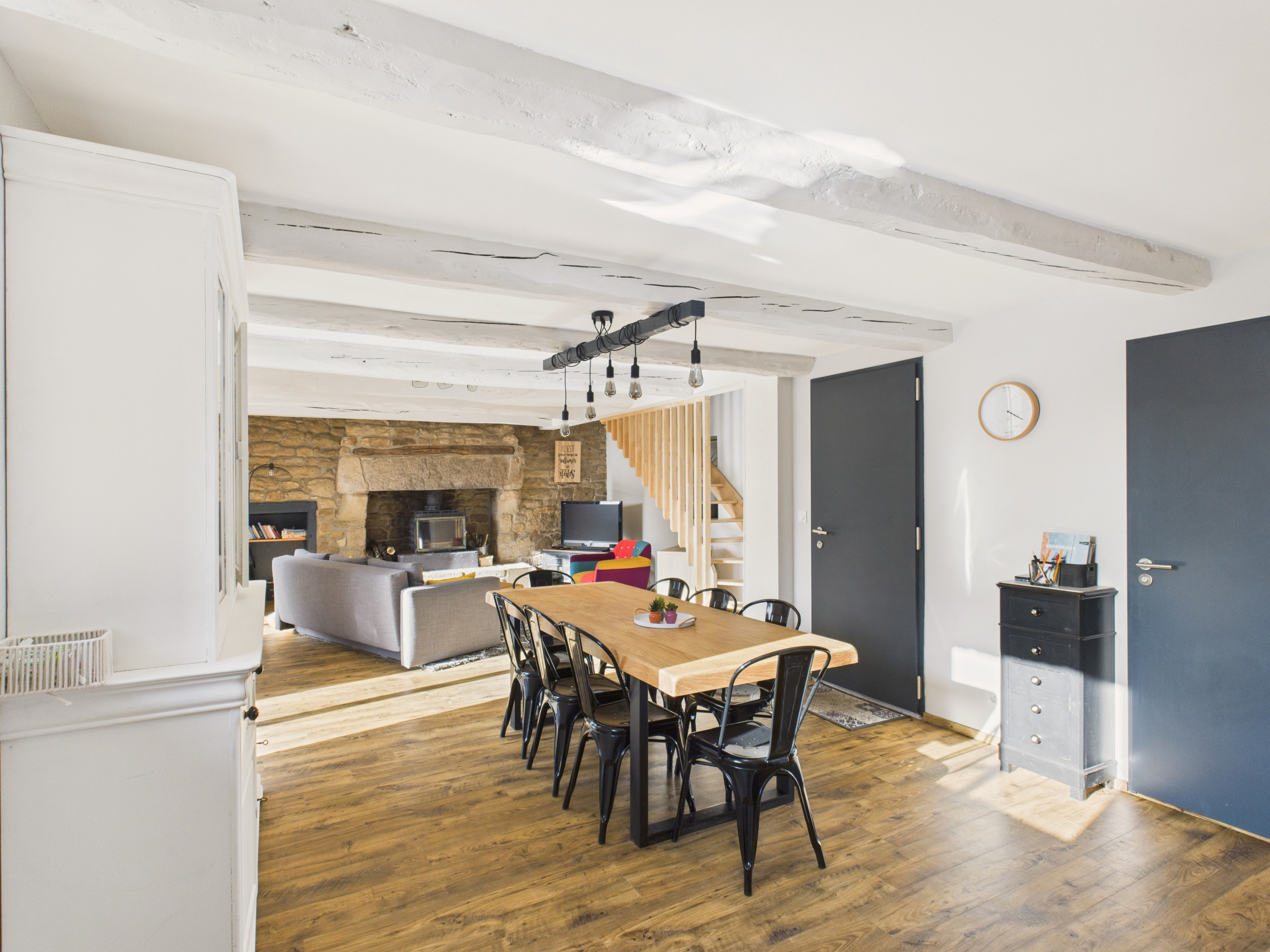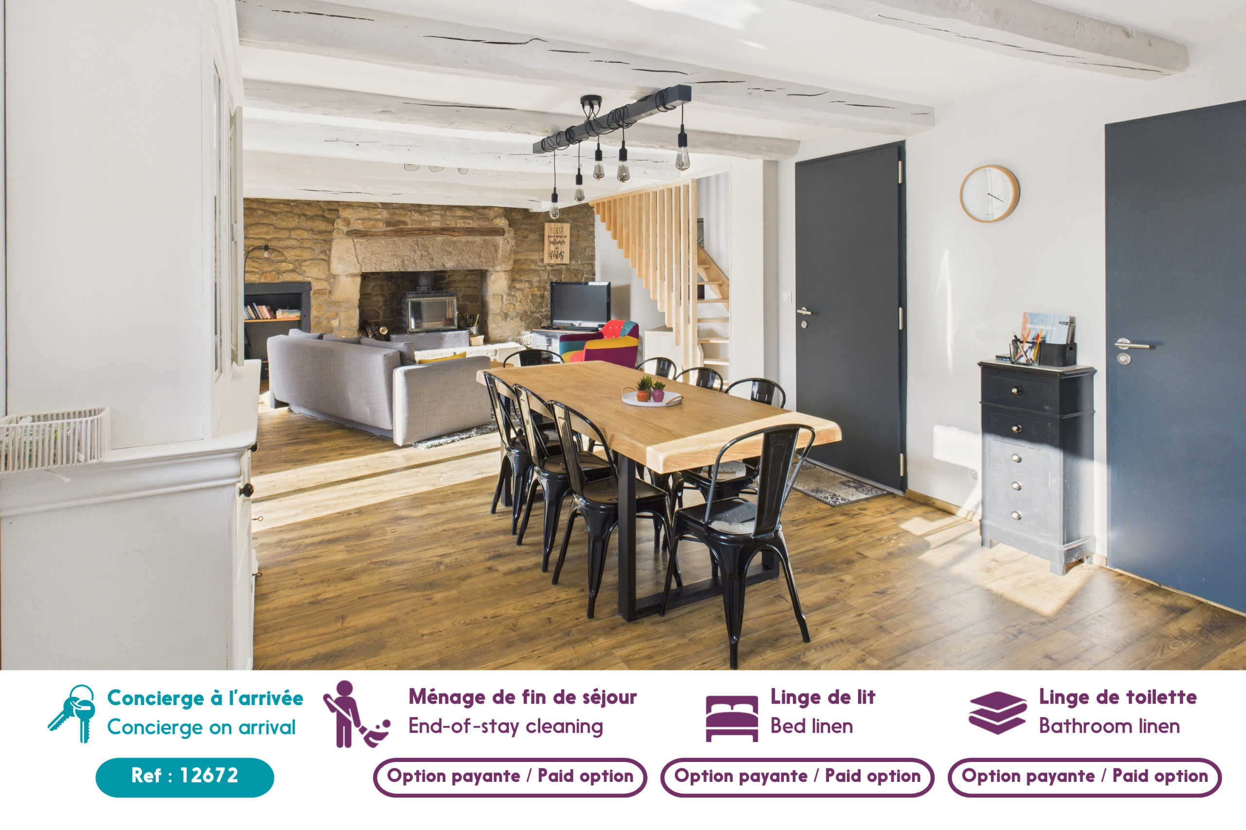 Enter through the entrance door and discover a large living room of 60 m², opening directly onto the terrace and garden. The open kitchen, fully equipped (refrigerator, oven, microwave, dishwasher and induction hobs), offers you everything you need to prepare your meals. For breakfast, a kettle, a toaster and a Senseo coffee maker are also available. Share your meals around the dining table, inside or outside on beautiful days. In the evening, relax in the quiet living area, comfortably seated on the sofa facing the television, near the decorative fireplace.