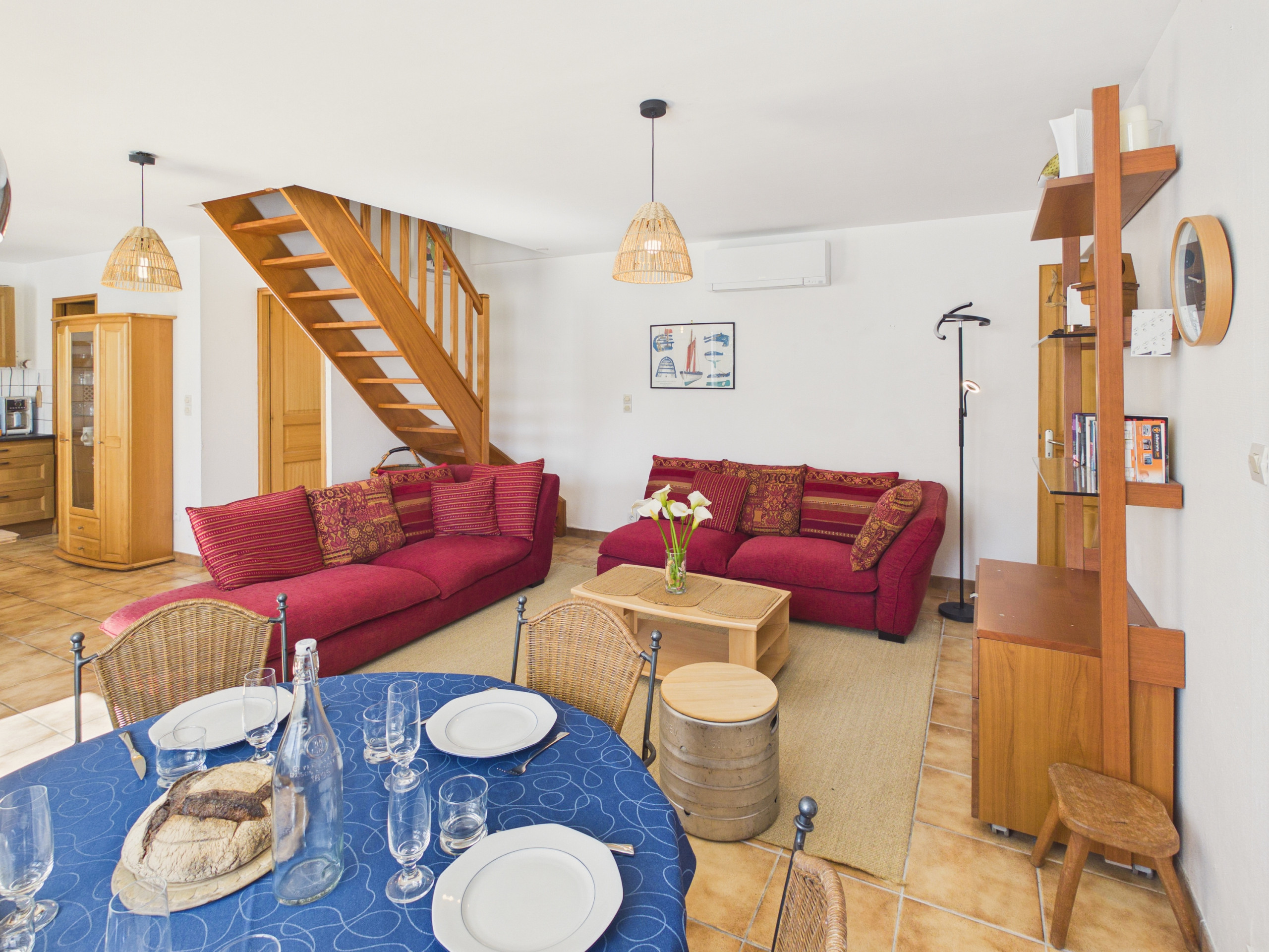 Enter through the entrance door and discover a pleasant living room with access to the terrace through a bay window. The modern and open kitchen is fully equipped (refrigerator, freezer, oven, microwave, dishwasher, induction hobs) to cook just like at home. For your breakfasts, a kettle, a toaster and a filter coffee maker are at your disposal. Share your meals around the dining table for 5 people or enjoy the one on the terrace on beautiful days. In the evening, gather in the living room, comfortably seated on the sofa facing the television.