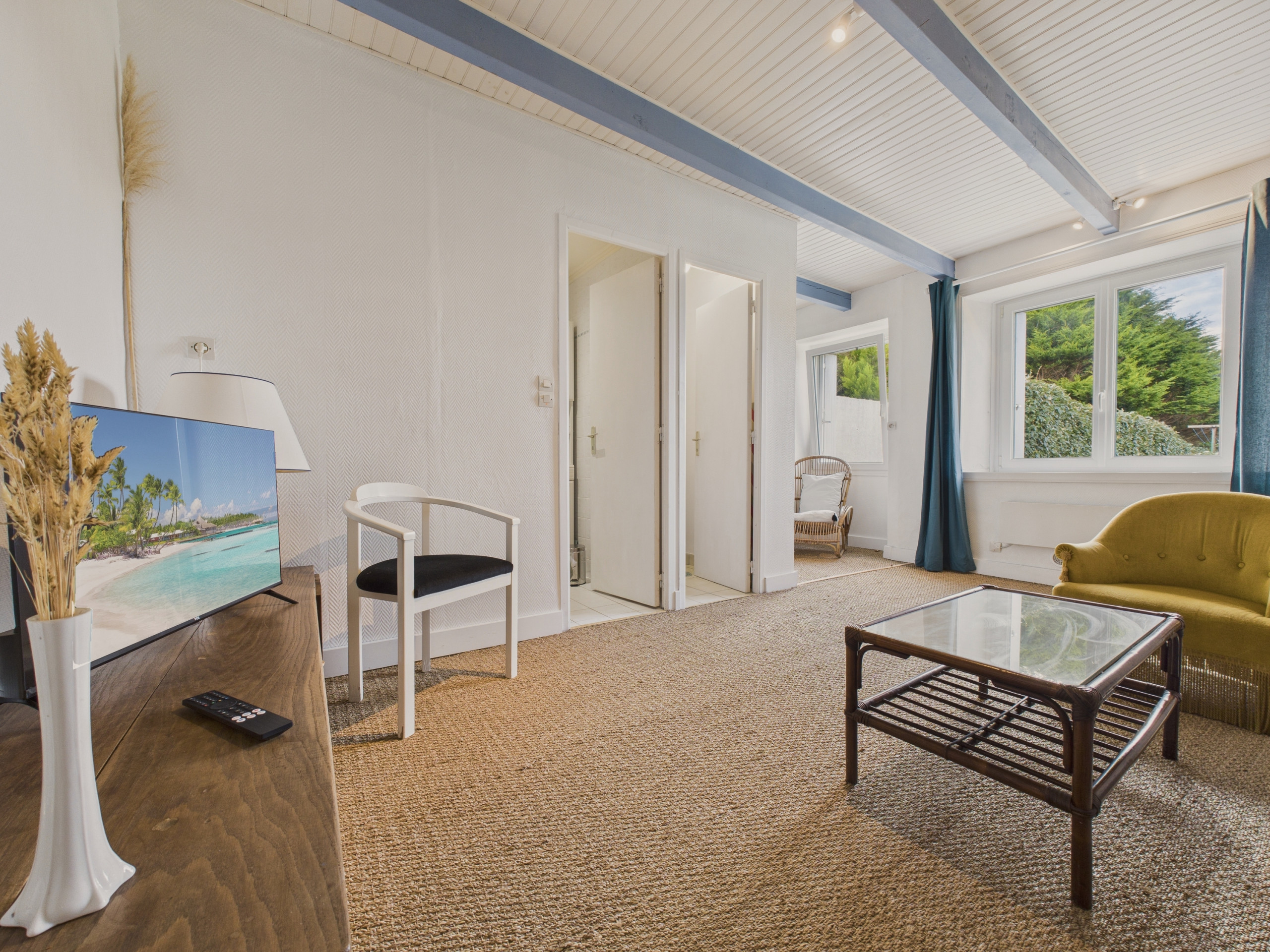 Enter through the entrance door and discover a pleasant living space. The independent, modern and fully equipped kitchen (refrigerator, freezer, gas hobs, oven, microwave) will allow you to cook as if at home. For your breakfasts, a kettle, toaster and filter coffee maker are at your disposal. Share your meals around the dining table for 5 or prefer the garden lounge in summer. In the evening, gather in the living room, comfortably seated on the sofa facing the television.
