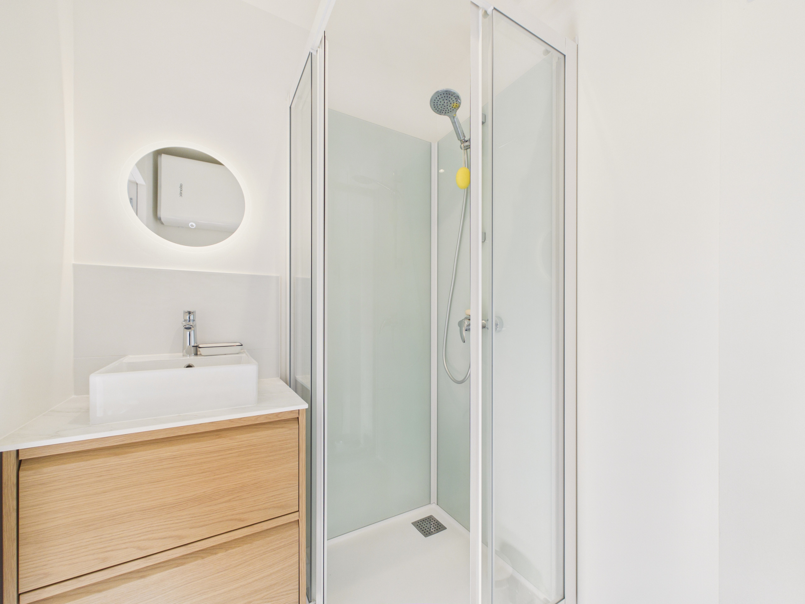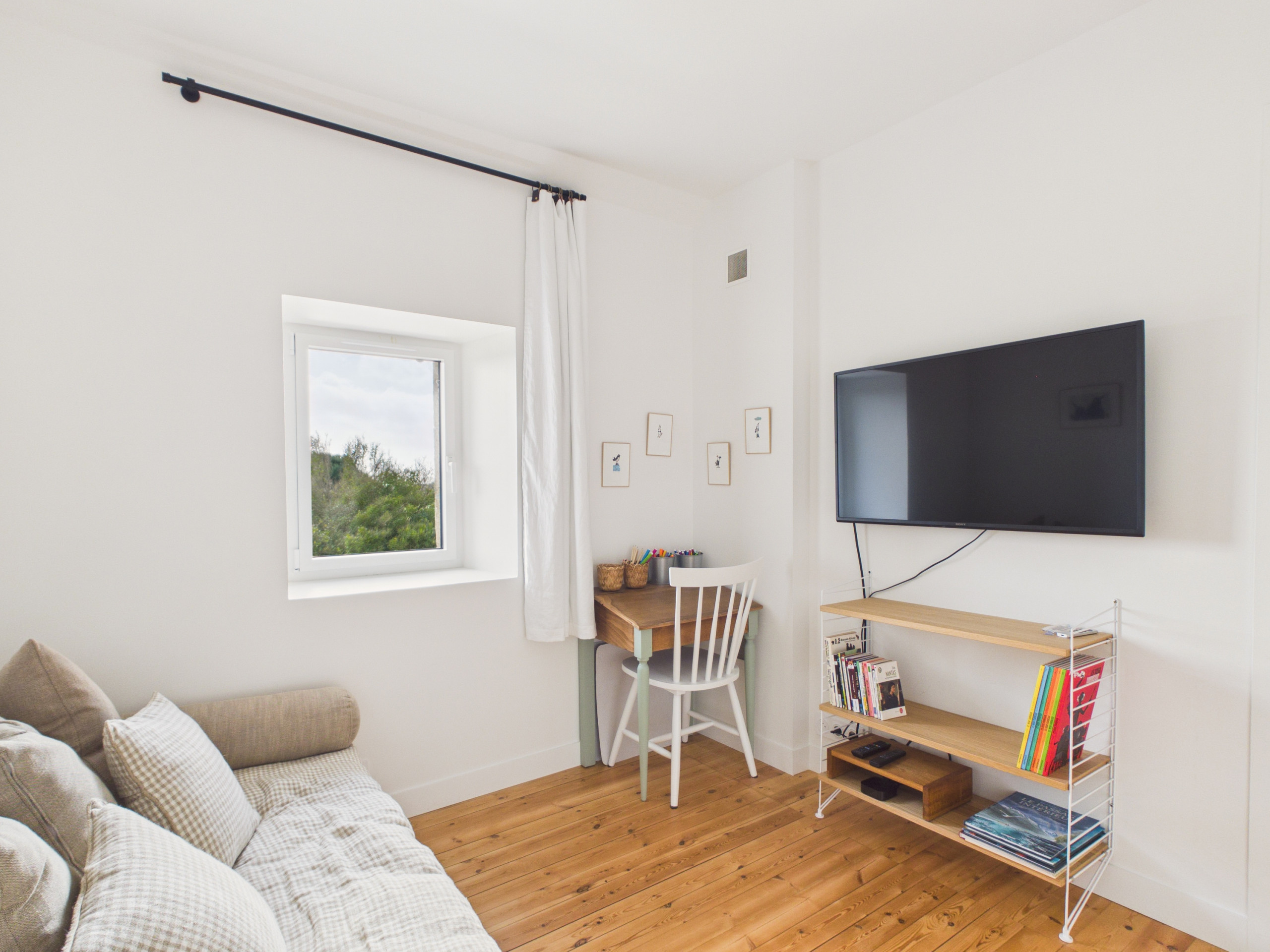 Upstairs, there are two bedrooms: one with a double bed (140/190) and the other with a bunk bed and a single bed (90/190). A bathroom is also available. On the second floor, the third bedroom, with a double bed (140/190), is ideal for observing the starry sky before falling asleep. A toilet is also present on this floor.