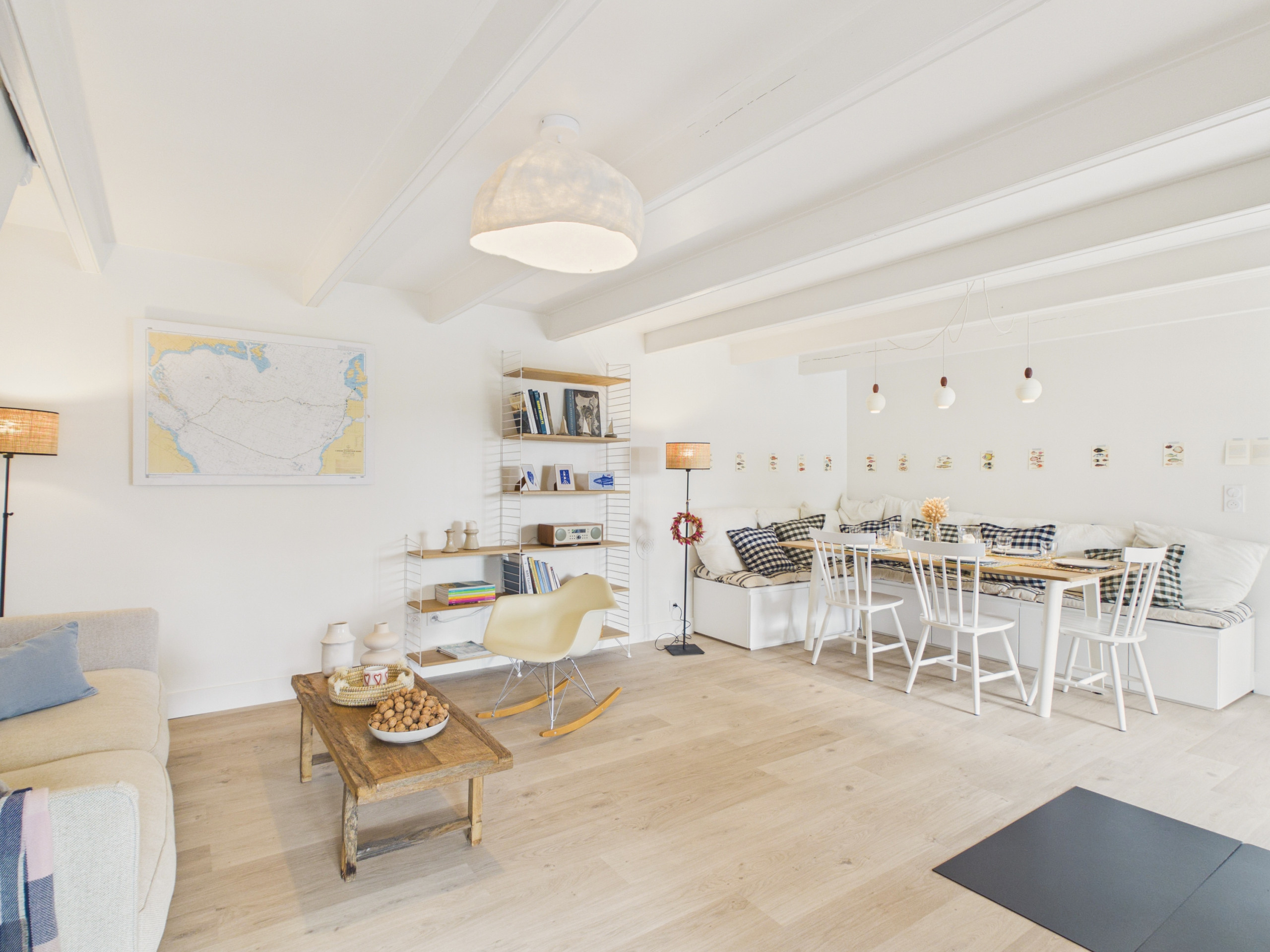 Inside, the entrance opens directly onto a beautiful, warm and welcoming living space. The living room is furnished with a comfortable sofa, a coffee table and a rocking chair, creating a cosy atmosphere in all seasons. On the other side of the room, a large table with corner bench and chairs can accommodate up to 7 people comfortably. The open-plan kitchen, long and spacious, is fully equipped: induction hobs, refrigerator, freezer, oven, microwave, dishwasher, kettle, Nespresso coffee machine and toaster.