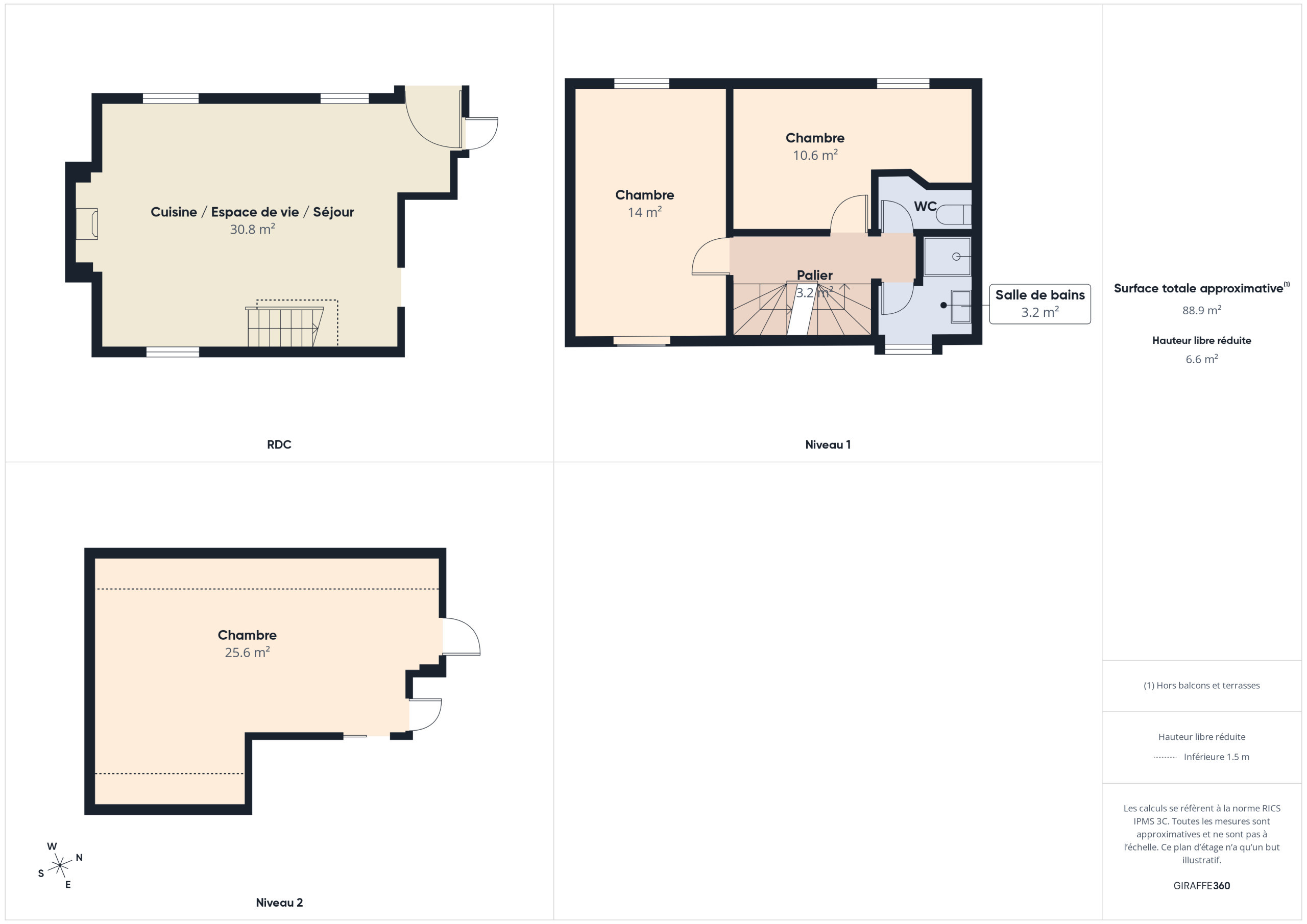 On the first floor, you will discover two bedrooms: one with a double bed (140x190 cm) and the other, a master suite with a Queen Size bed (160x200 cm) and its private bathroom. An additional bathroom is also on this floor.