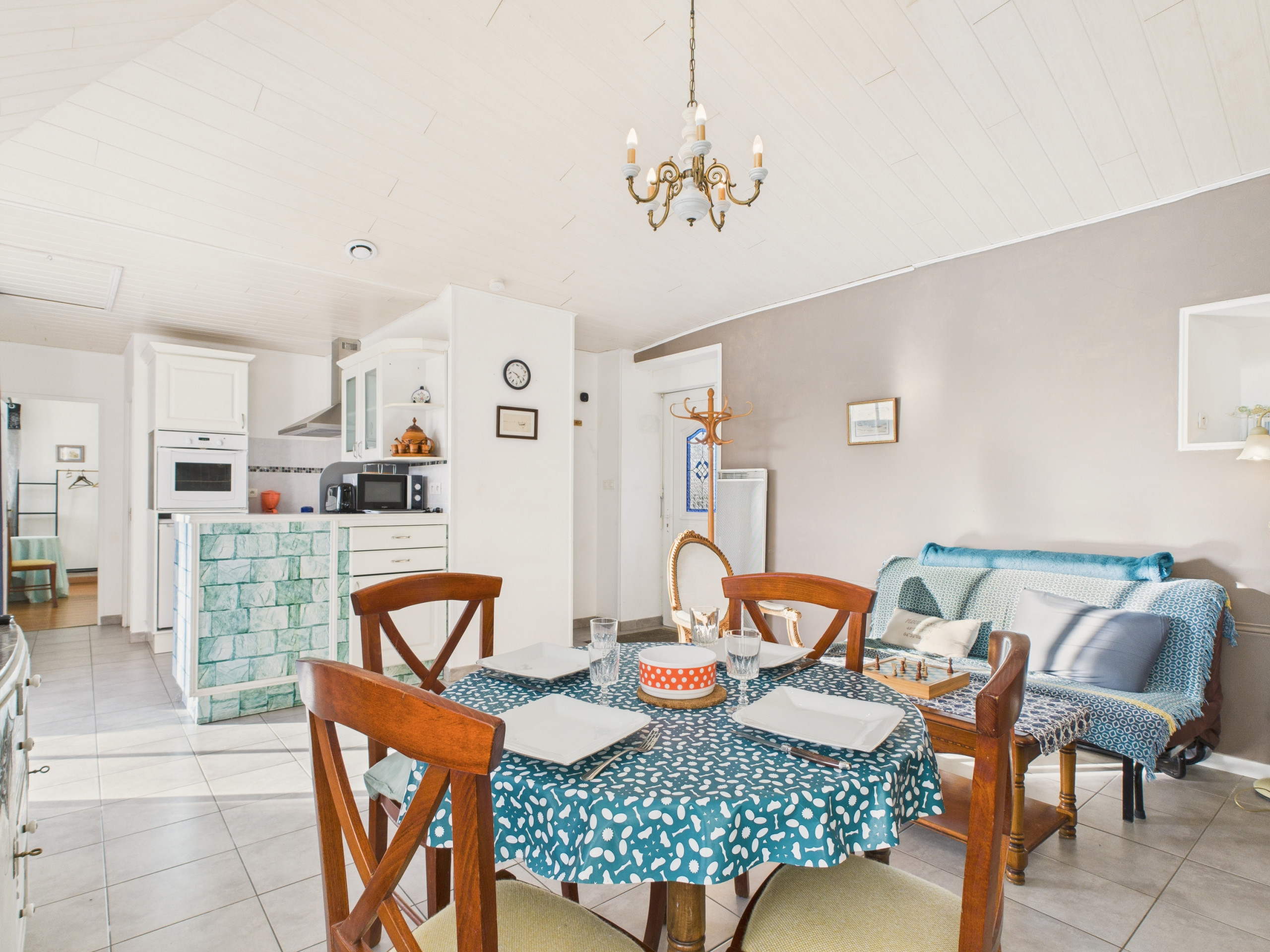 Enter through the entrance door and discover a lovely living area of 30m2, giving access to the garden. The open kitchen, fully equipped (refrigerator, freezer, microwave, oven, induction hobs), provides you with everything necessary to prepare your meals. For breakfast, you will also find a kettle, a toaster and a filter coffee maker. Share your meals around the dining table, then enjoy a moment of relaxation in the living room, near the fireplace, comfortably seated on the sofa in front of the television.