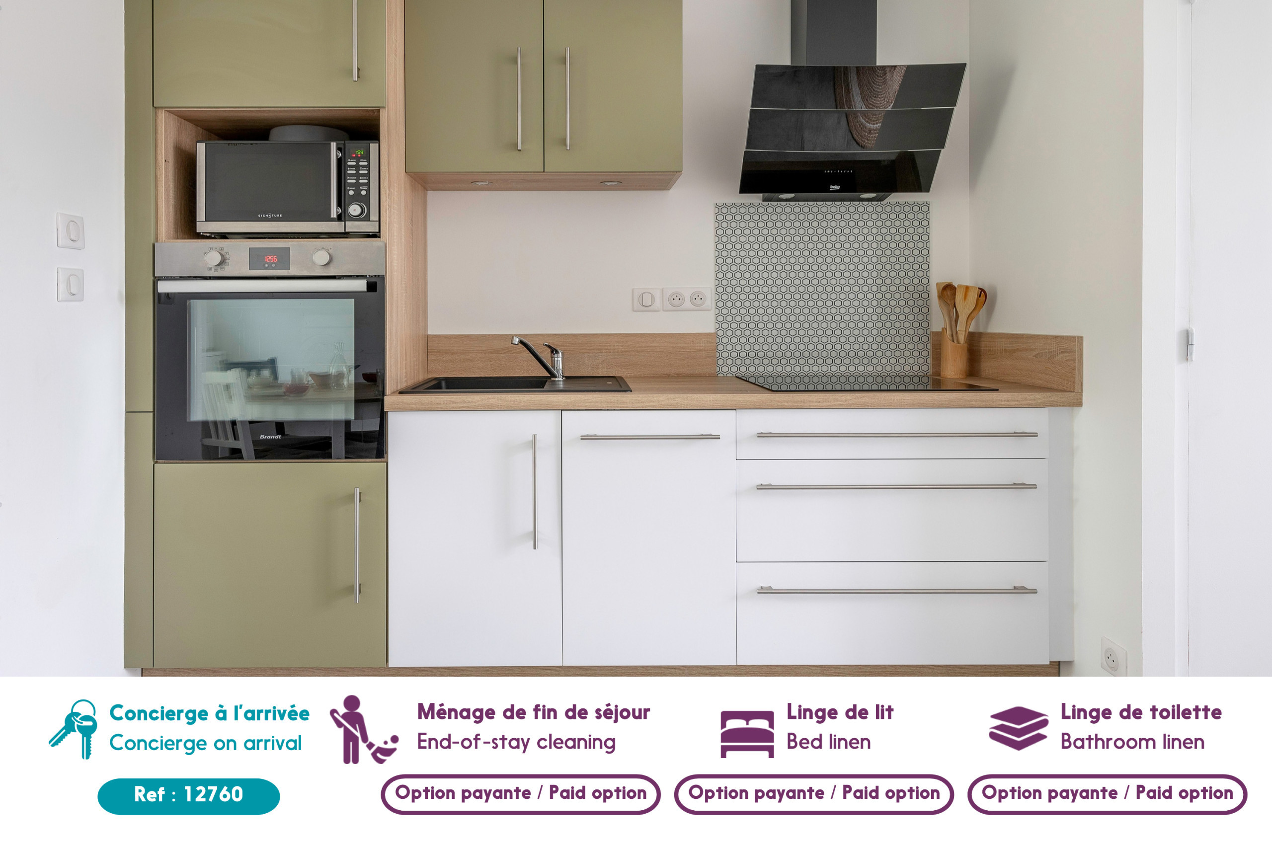 Upon your arrival, you will discover a pleasant living area comprising a living room, a dining room and an open kitchen. Fully equipped, it provides you with: an oven, a microwave, a dishwasher, a kettle, a toaster and a Nespresso coffee machine.
