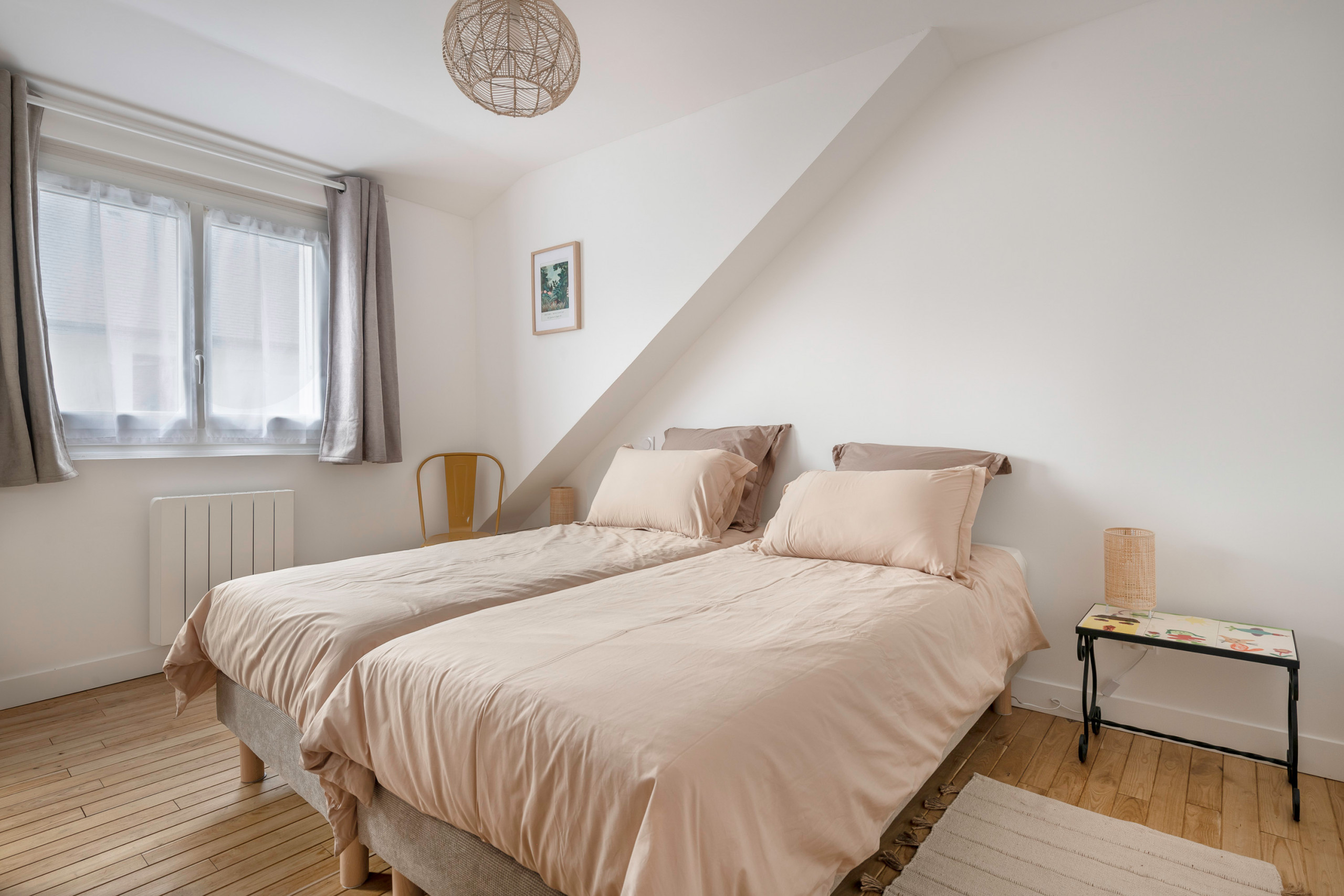 Upstairs, you will find two bedrooms, with new bedding and both benefiting from an adjoining shower room, each with a hair dryer. The first will be ideal for a couple or parents with its large double bed (160x200) then the second can accommodate another duo or children with its two single beds (80x190). A space is also set up so that children can meet up to read and have fun.