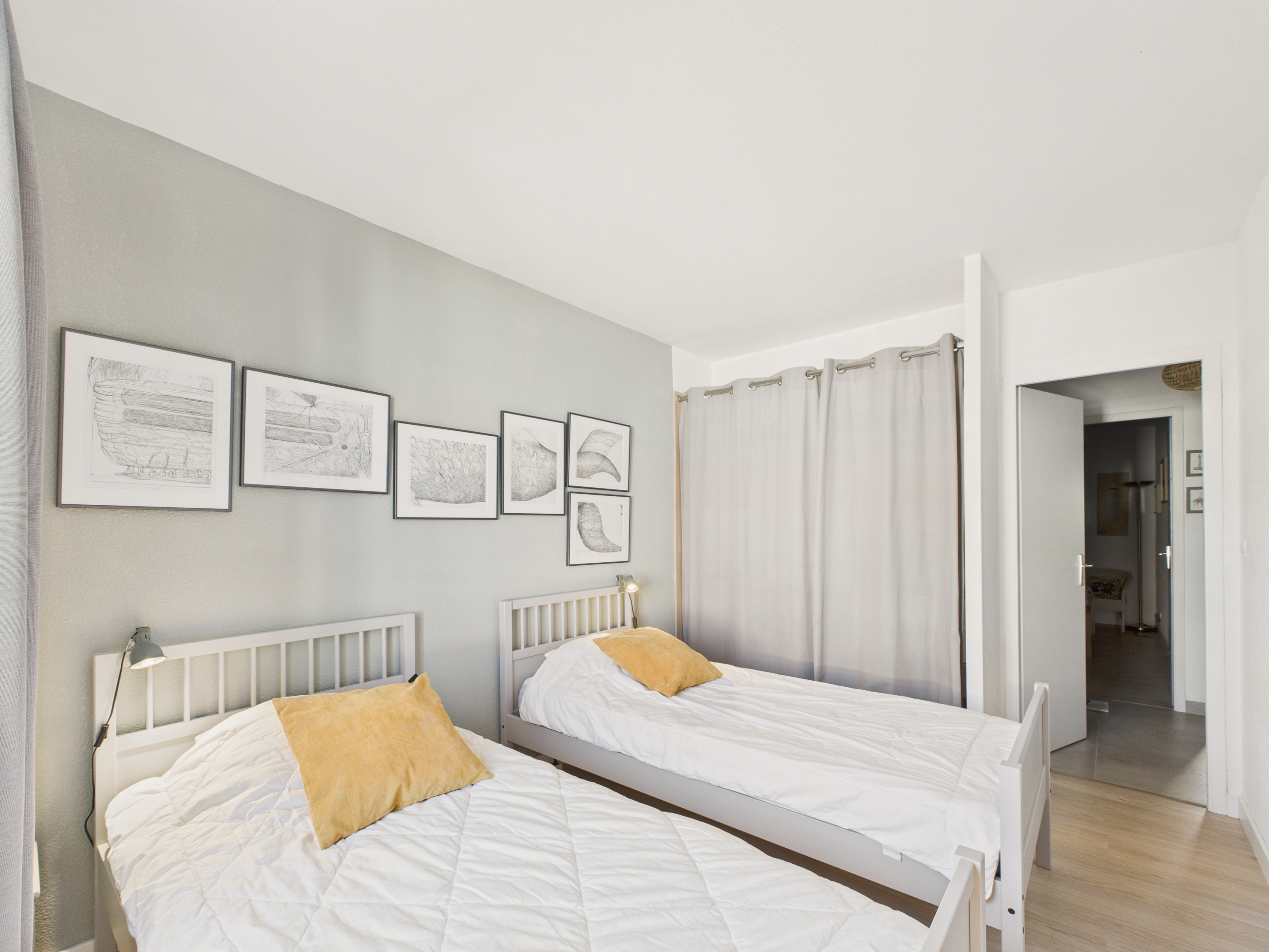 Upstairs, two additional bedrooms, each equipped with two single beds (80x190) that can be combined into a Queen Size bed (160x190), complete the sleeping area. A bathroom with a bathtub and WC, as well as a separate WC, are also at your disposal for added comfort. At this level, a reading corner has been set up on the landing to allow you to enjoy a moment of calm. A door will allow you to access a second terrace outside, where a small garden furniture awaits you to enjoy the panoramic view of the garden.