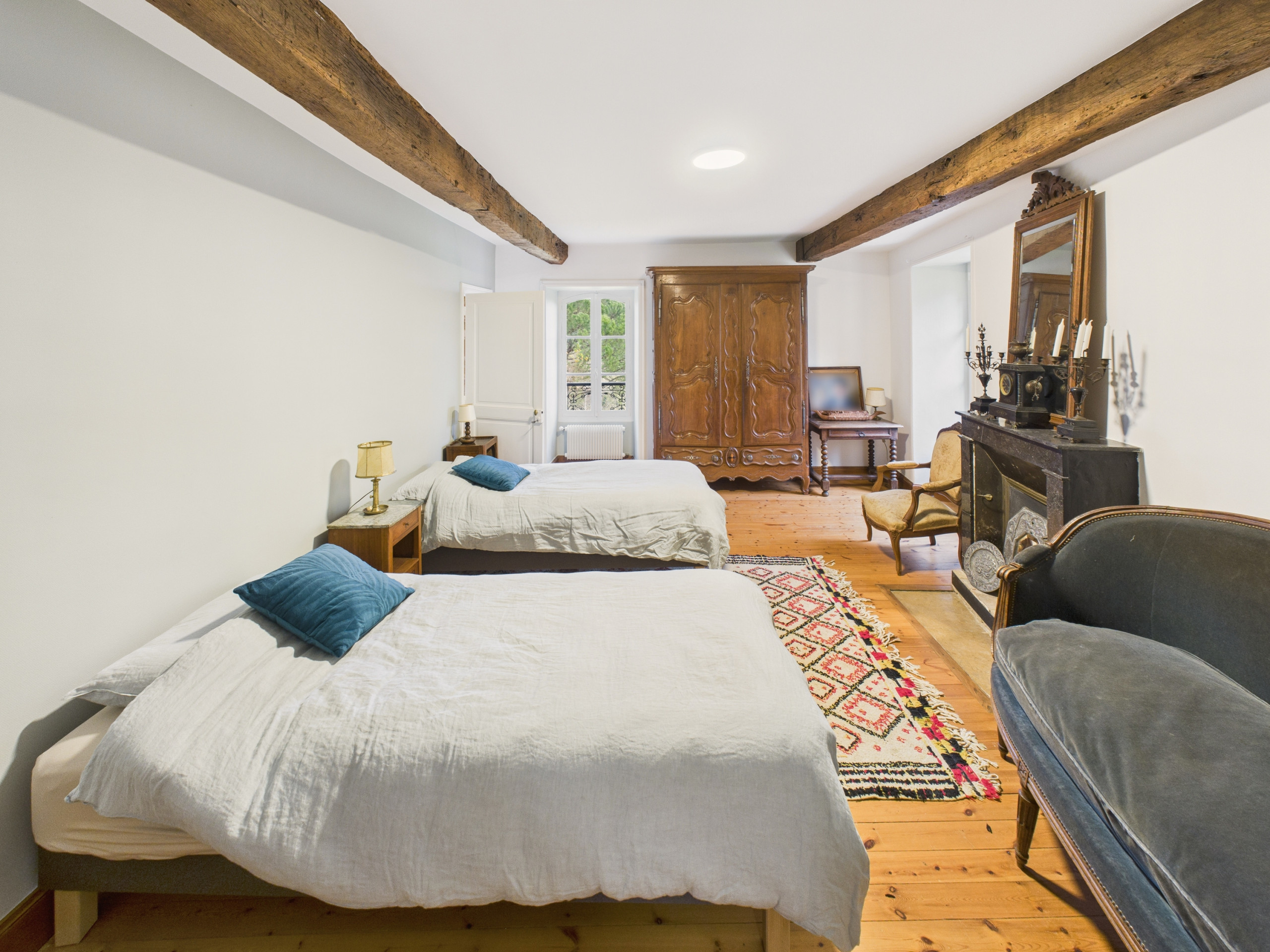 Bedroom 4: large bedroom of 23 m² with two single beds (90x190 cm) and a decorative fireplace
