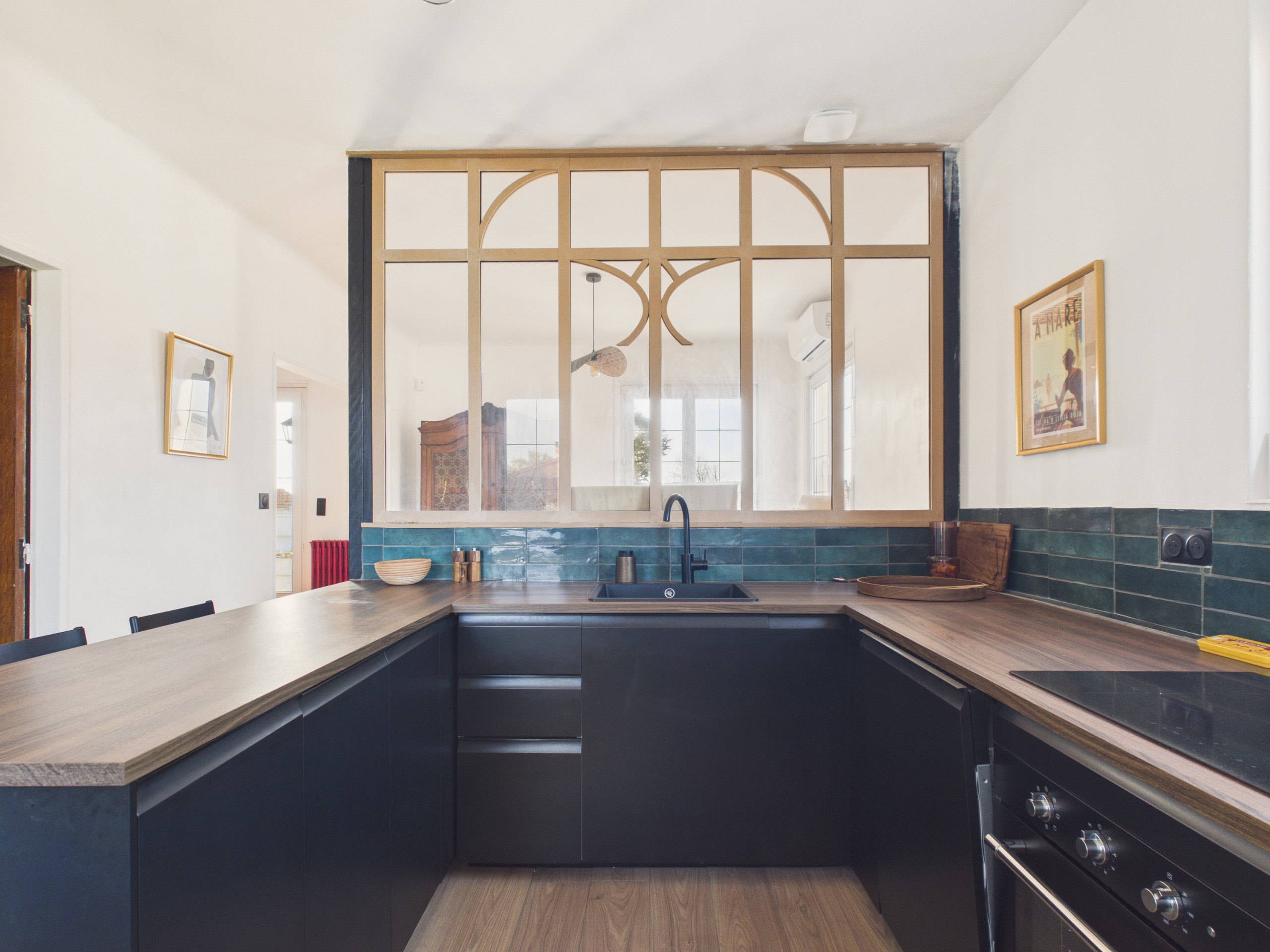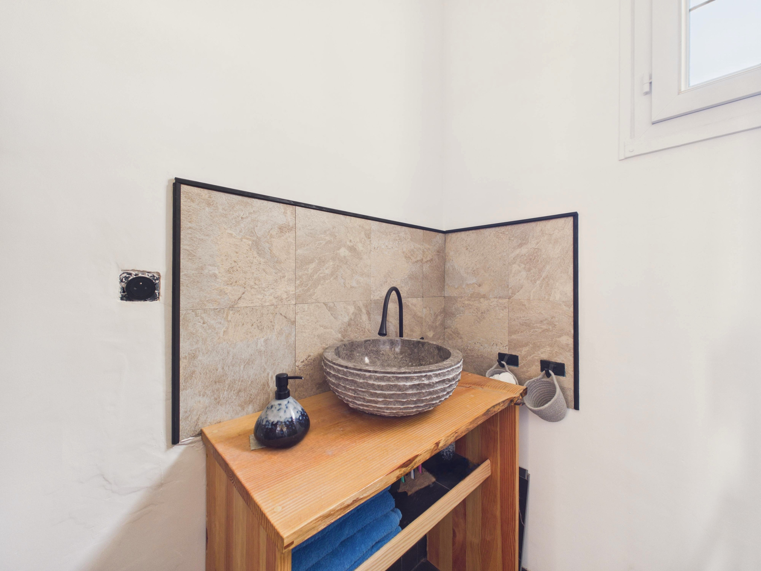 Access to the house entrance is via an external staircase leading to the main floor of the house. You arrive in a corridor serving the different living rooms. On the left, the living room welcomes you with several comfortable armchairs, a decorative fireplace and a television (without channels at the moment, awaiting fibre installation). In continuation, the dining room has a large table that can accommodate up to 8 guests, ideal for family meals. The semi-open kitchen, friendly and functional, is equipped with induction hobs, refrigerator, freezer, oven, microwave, dishwasher, filter coffee maker, toaster and kettle. A bar area with a high table and stools completes the ensemble.
