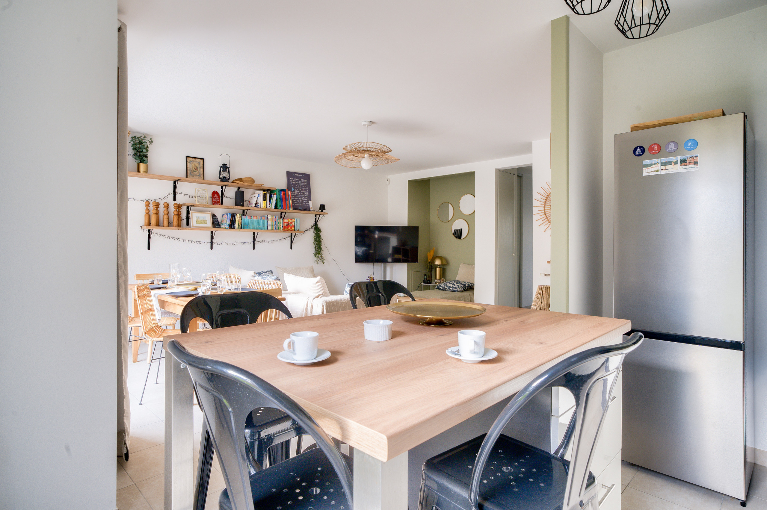 The living space is bright and open, its two windows have a view of the garden, you will find a well-equipped kitchen (ceramic stovetop, refrigerator, microwave, oven, dishwasher, filter coffee maker, toaster and kettle), a dining area, ideal for sharing meals and moments of conviviality.