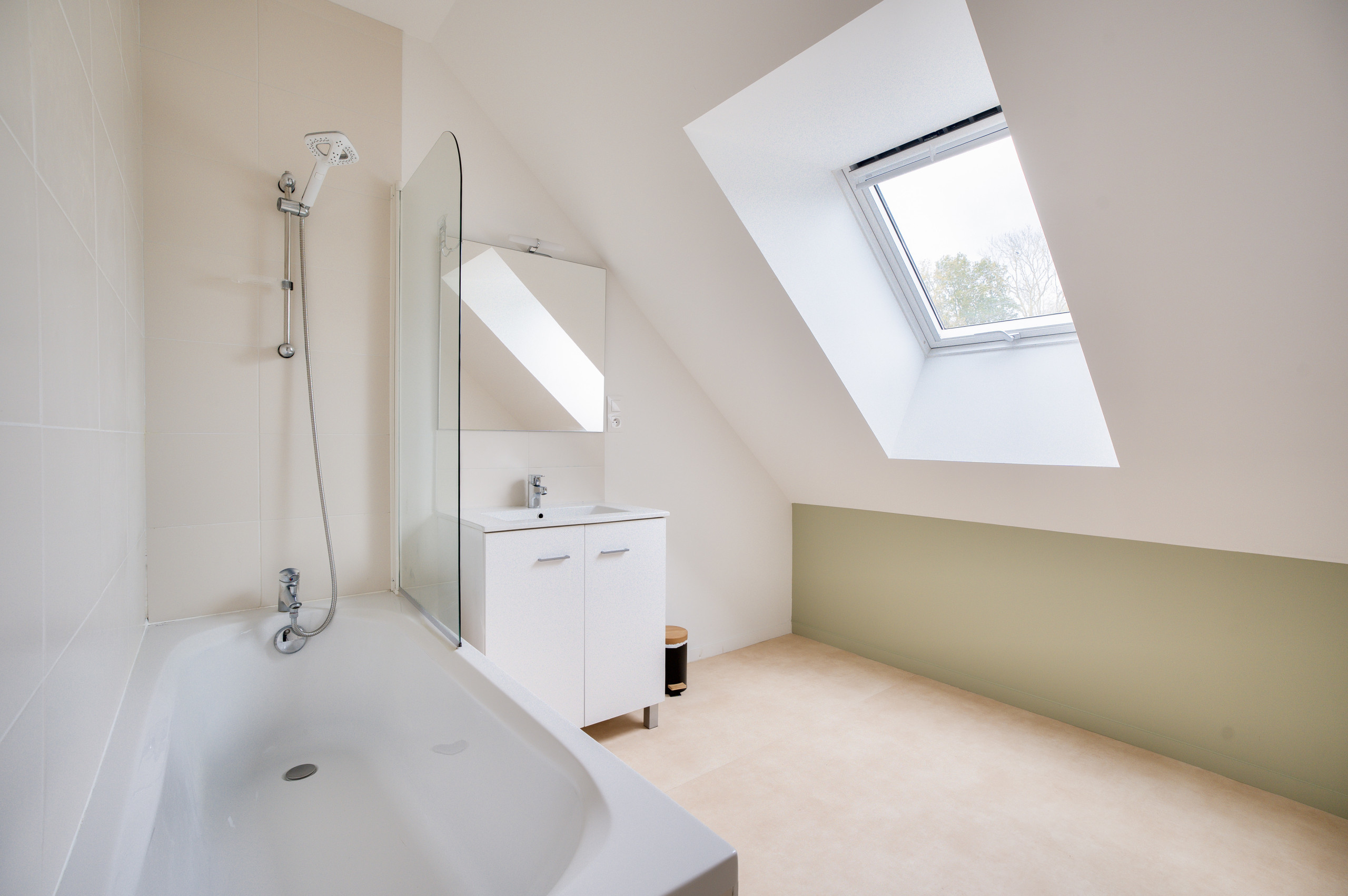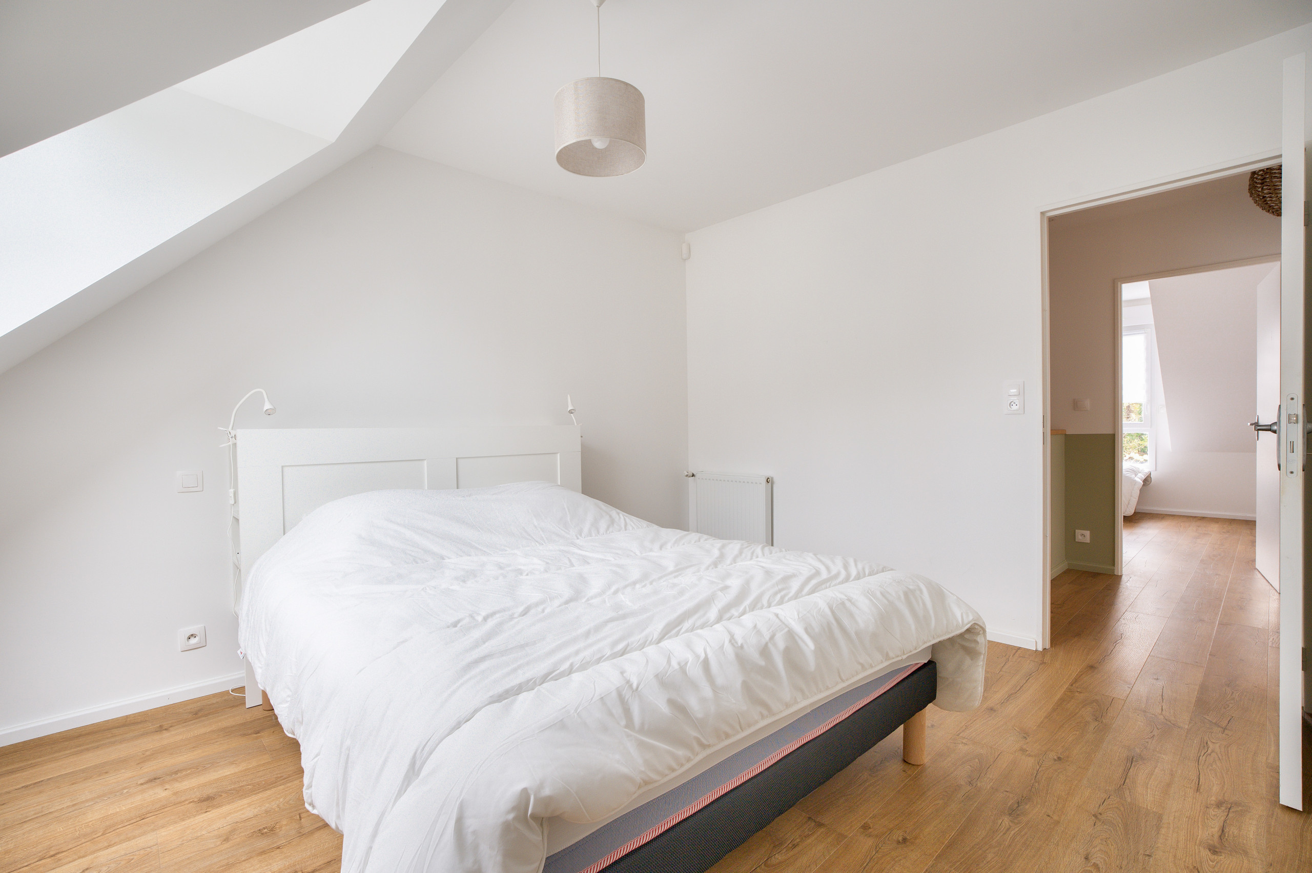 Upstairs, the sleeping area consists of a bedroom with a Queen Size bed (160 x 200) and a small workspace. A second bedroom also offers a Queen Size bed (160 x 200). In the third bedroom, you will find two single beds (90 x 200). The bathroom has a bathtub, washbasins, a hairdryer, and a towel dryer. A workspace located in a mezzanine with chair and armchair (ideal for teleworking). A separate toilet is also located upstairs.