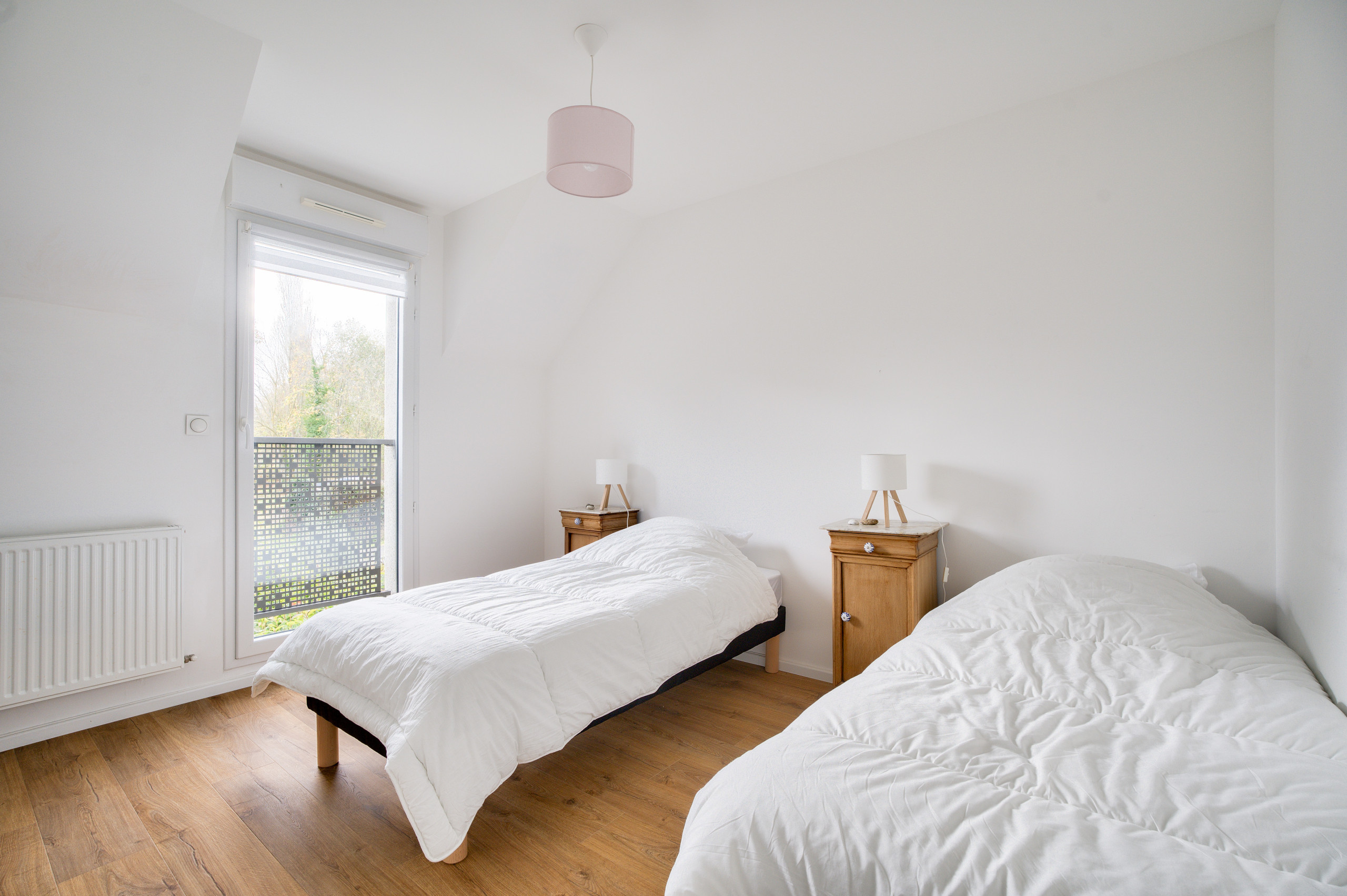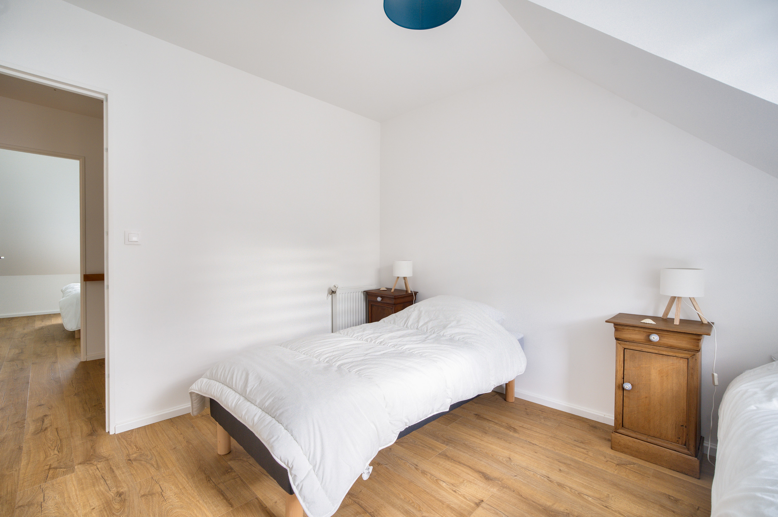 Upstairs, the sleeping area consists of three comfortable bedrooms: the first, on the right, has a Queen Size bed (160x200cm). The next two bedrooms, located on the left side, are each equipped with two single beds (90x190), ideal for accommodating children or friends. A bathroom with a washing machine is also located on this level, as well as an independent toilet at the end of the corridor.