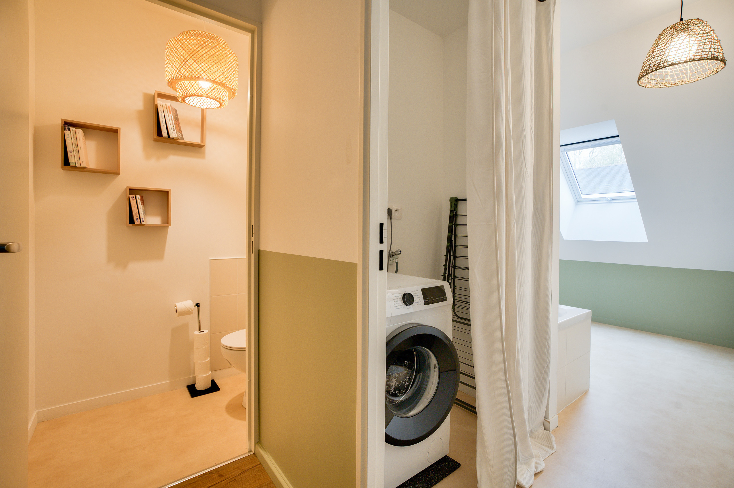 On the ground floor, you will find a living room with a sofa, television and dining table for 6 people. A fully equipped kitchen with oven, microwave, Senseo pod coffee maker, kettle, induction hob, freezer, refrigerator, toaster. A bathroom with shower, washbasin, heated towel rail, as well as a separate toilet. A laundry room with washing machine, ironing board and iron, a clothes horse and a clothesline. A garage accessible for charging an electric vehicle and with 4 bicycles (with helmets and locks).