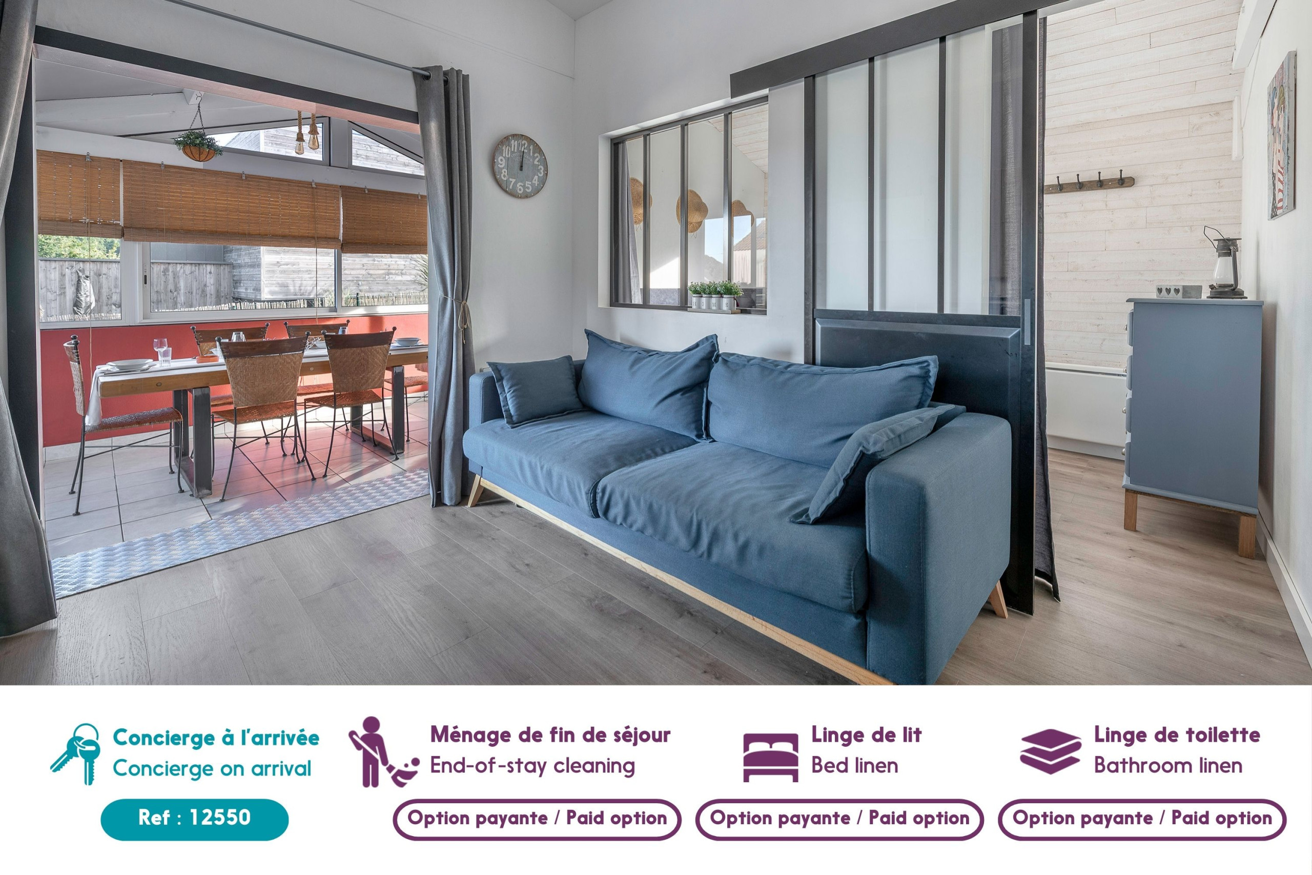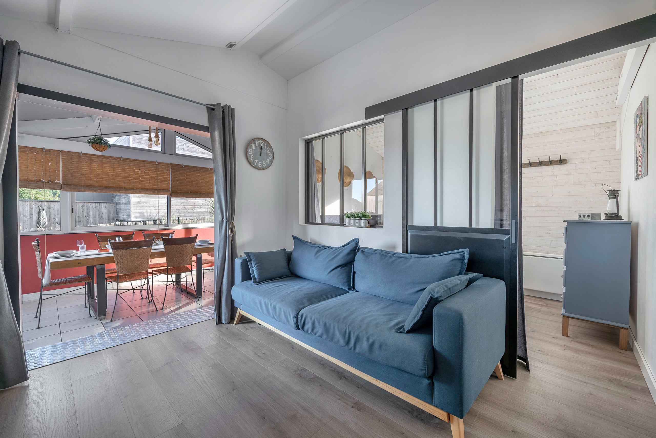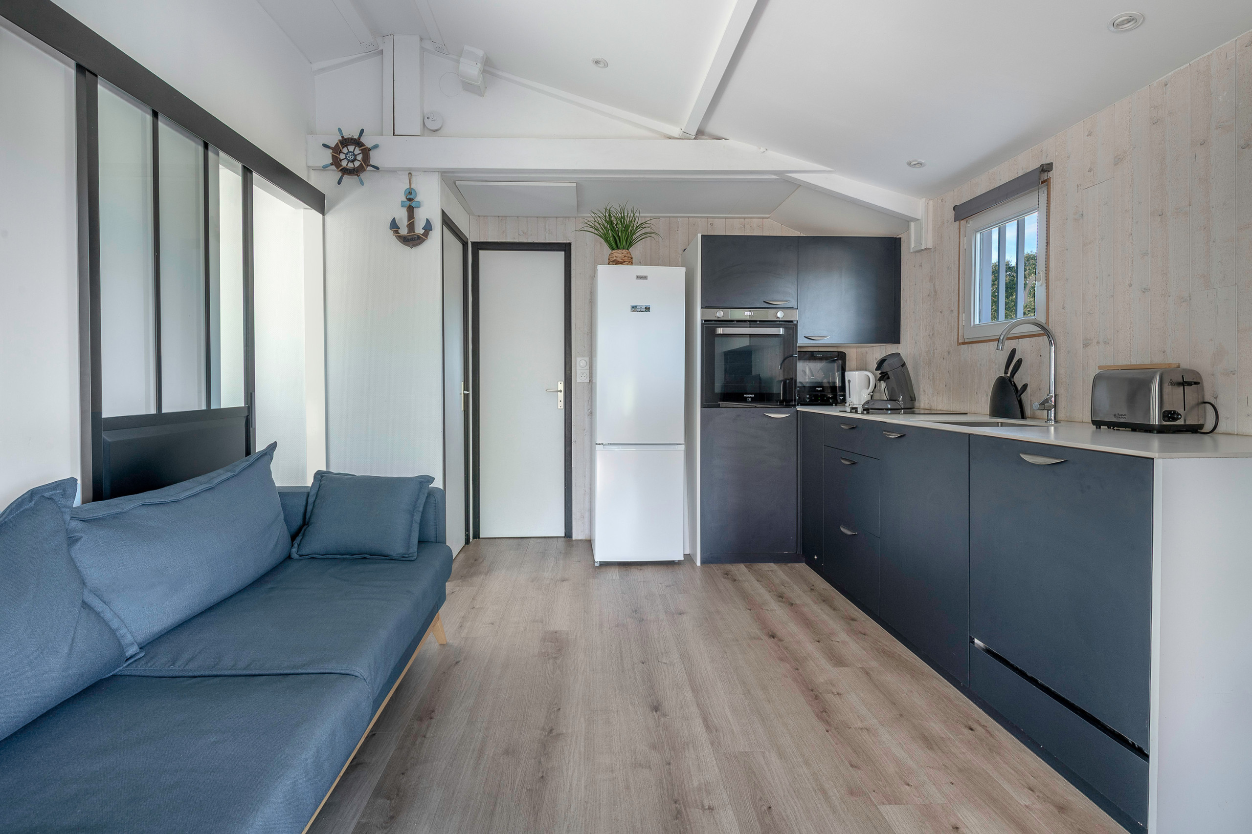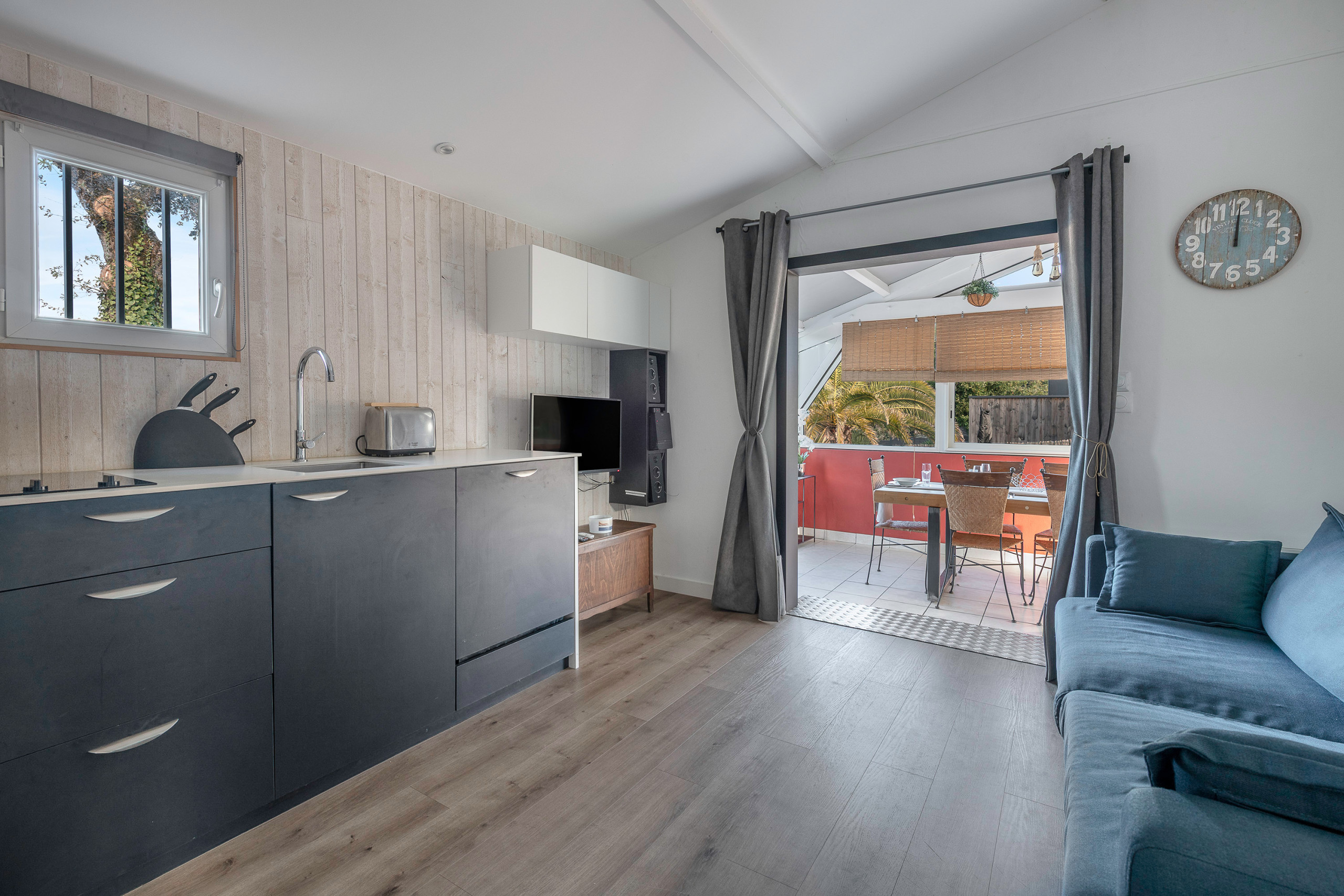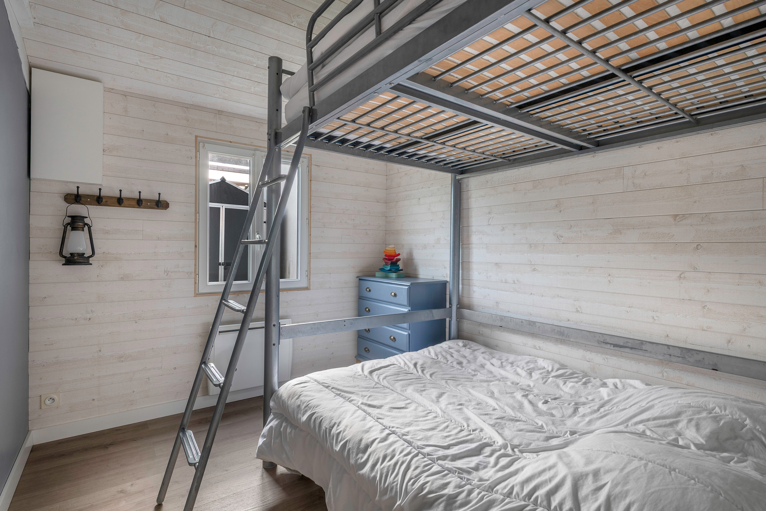 The accommodation consists of a veranda / dining room, a TV lounge with a kitchen equipped with all the necessary household appliances to make you feel at home: double induction hob, extractor hood, oven, microwave, filter coffee maker and Senseo, toaster, kettle. On the sleeping side, you will have a double room (140), a triple room with a double bunk bed (2 x 140) and a bathroom with toilet.