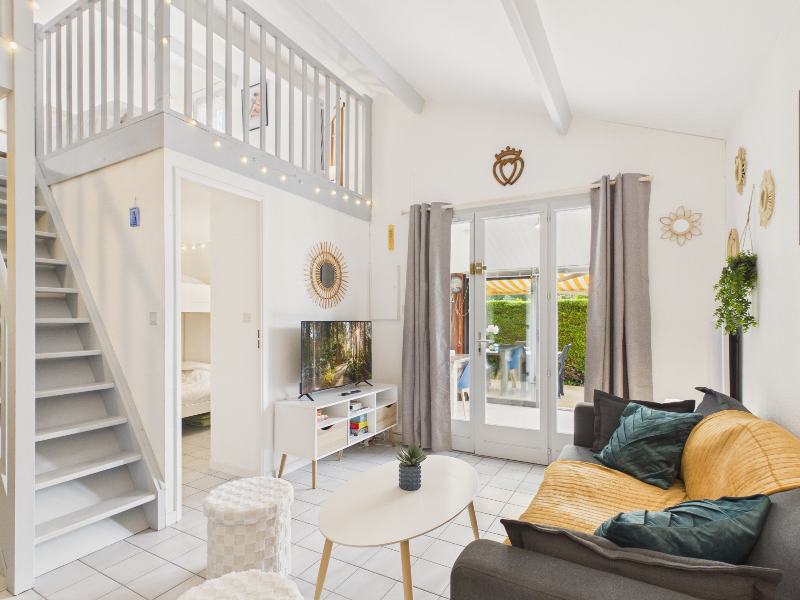 On the sleeping side, the house offers several well-thought-out sleeping spaces: a first bedroom with a single trundle bed (90x190) gives access to a second bedroom with a large King Size bed (180x200). Upstairs, a mezzanine accessible by a staircase in the living area accommodates two single beds (90x190), ideal for children or teenagers. The bathroom, equipped with a toilet and a hairdryer, completes the ensemble.
