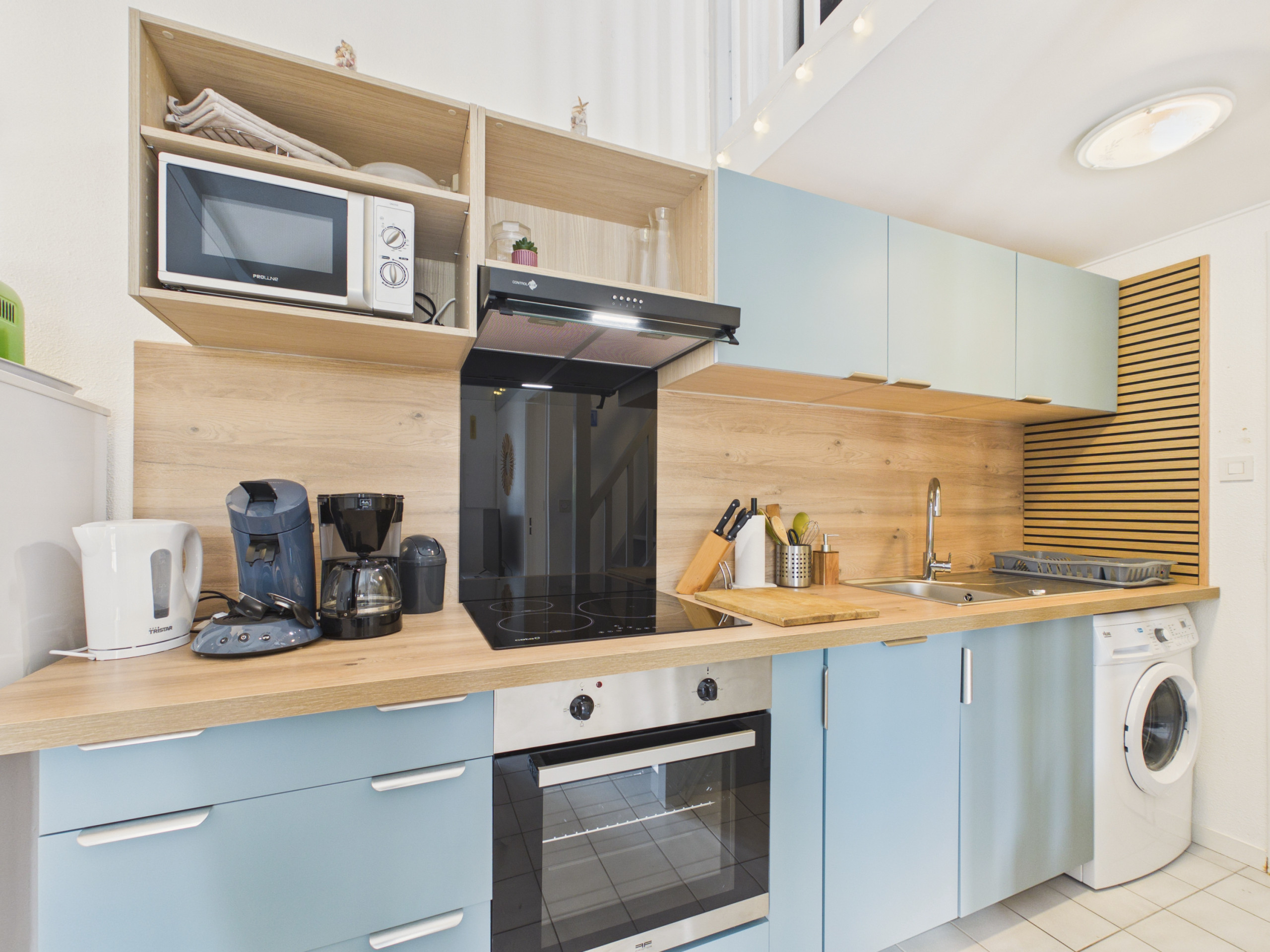 The kitchen, open to the living space and fully equipped (induction hobs, extractor hood, refrigerator, oven, freezer, microwave, dishwasher), provides you with everything you need to prepare your meals. For breakfast, you will find a kettle, a toaster as well as two coffee makers **filter and Senseo**.
