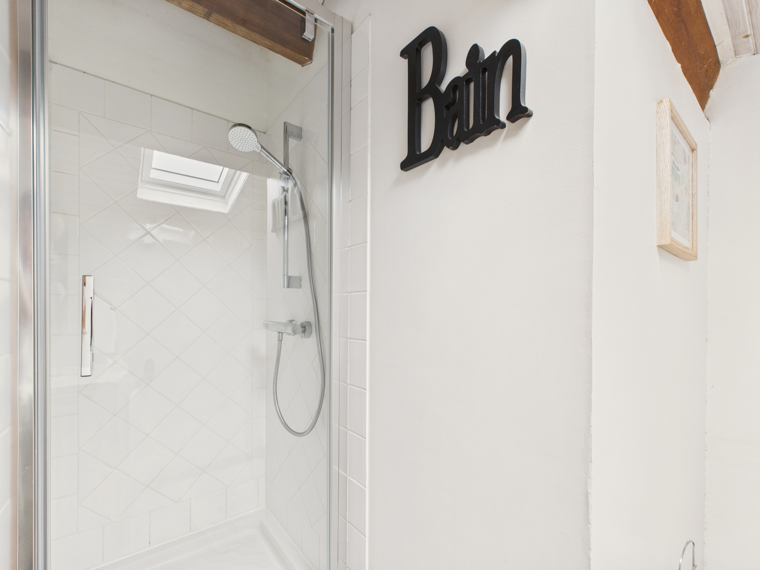 Upstairs, you will access the bedrooms, all equipped with high-end bedding: two rooms each have a Queen Size bed (160x200), and the third is fitted with a bunk bed. A baby bed is also available if needed. The bathroom is located upstairs and is equipped with a hairdryer. The staircase to access the upper floor is quite steep, reflecting the charm of the old. A child safety gate is installed, but vigilance is recommended with young children.