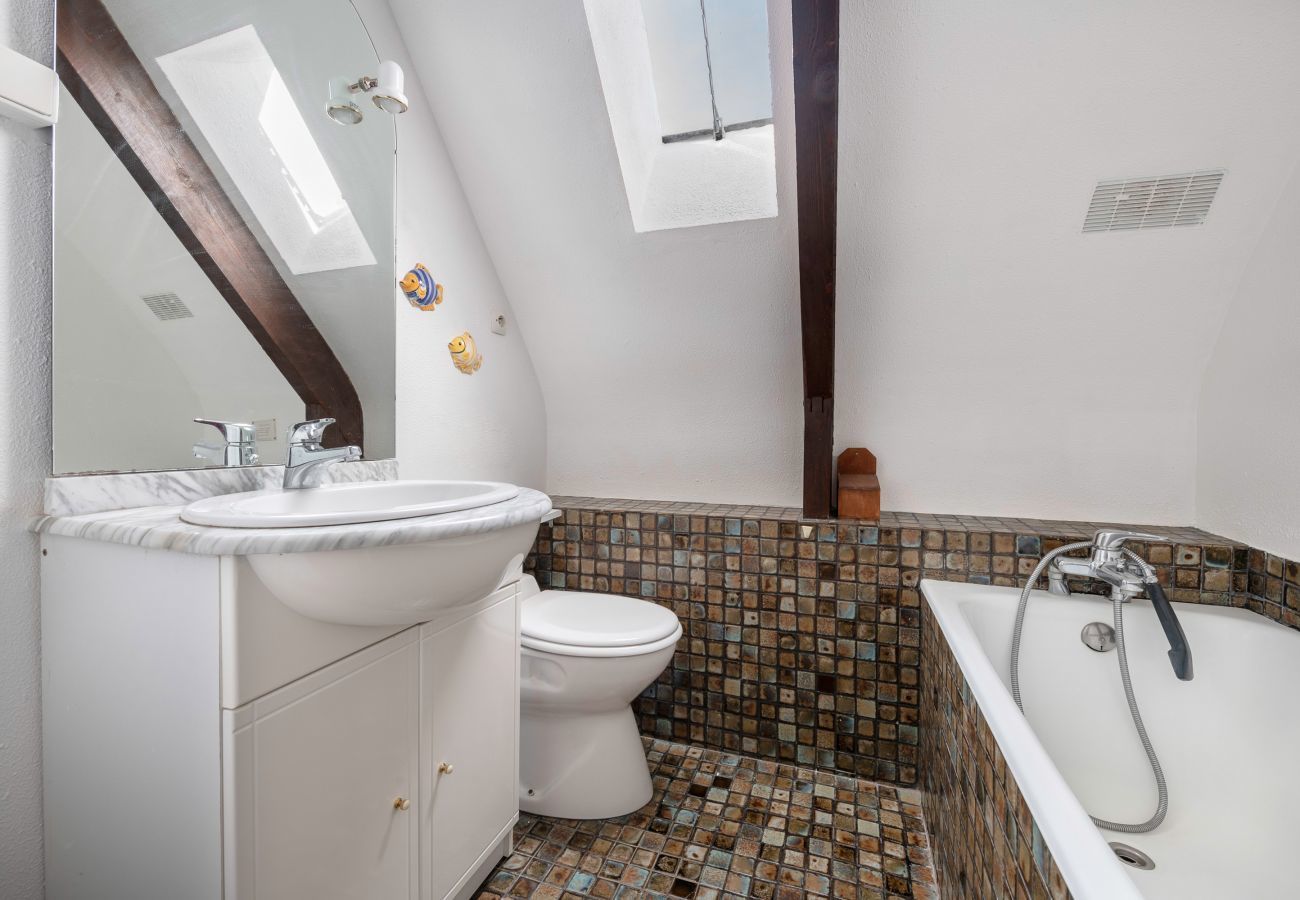 Upstairs, you will find three bedrooms, all with sloping ceilings, which make them cozy cocoons where you want to rest. The first one with a double bed will be ideal for parents, the second will delight teenagers or another couple, because it has two single beds and finally the last one will be perfect for children, since it has a pull-out bed.