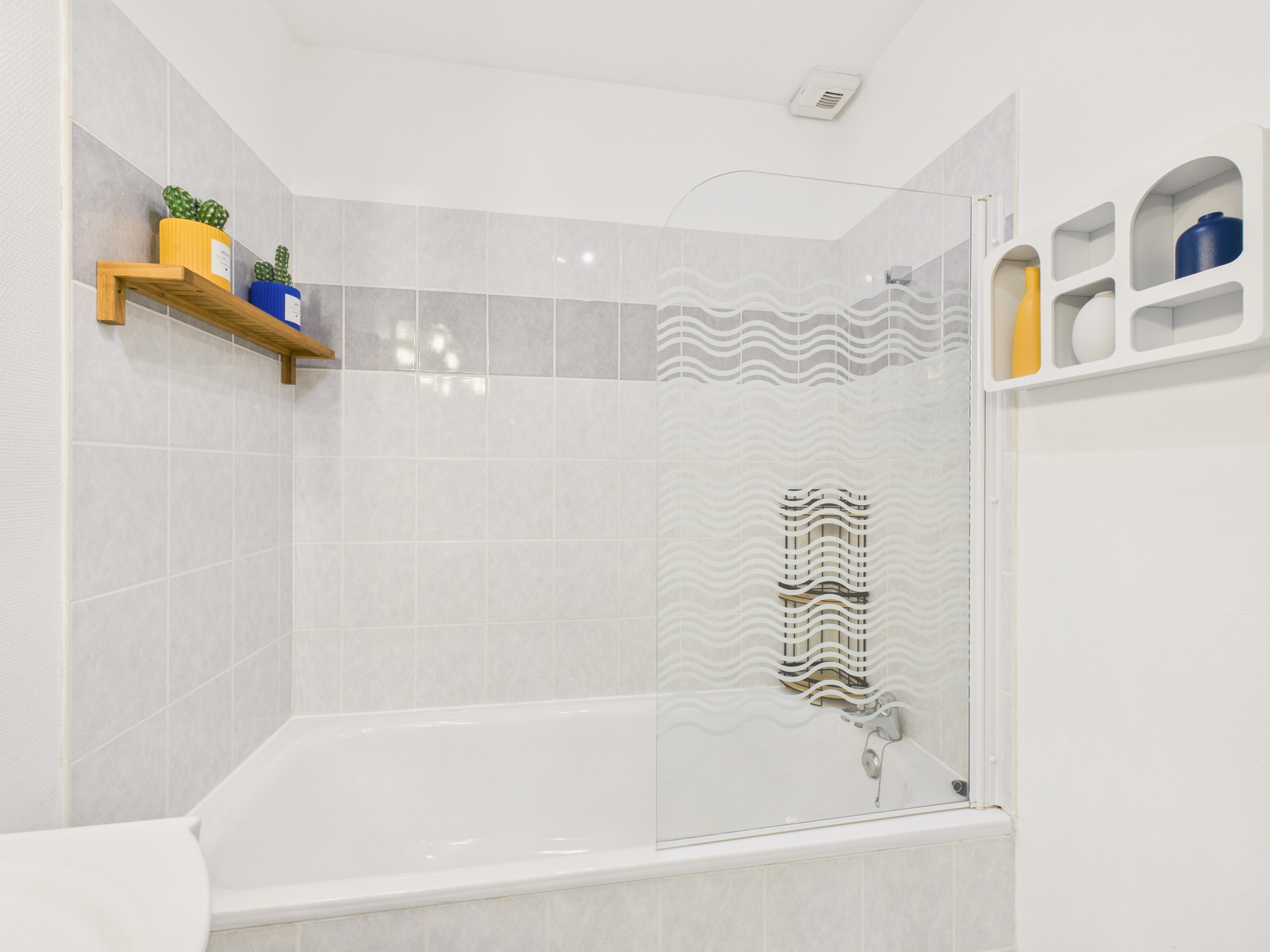 The bathroom, located upstairs, is equipped with a bathtub and a hairdryer. The toilet is separate for greater comfort.