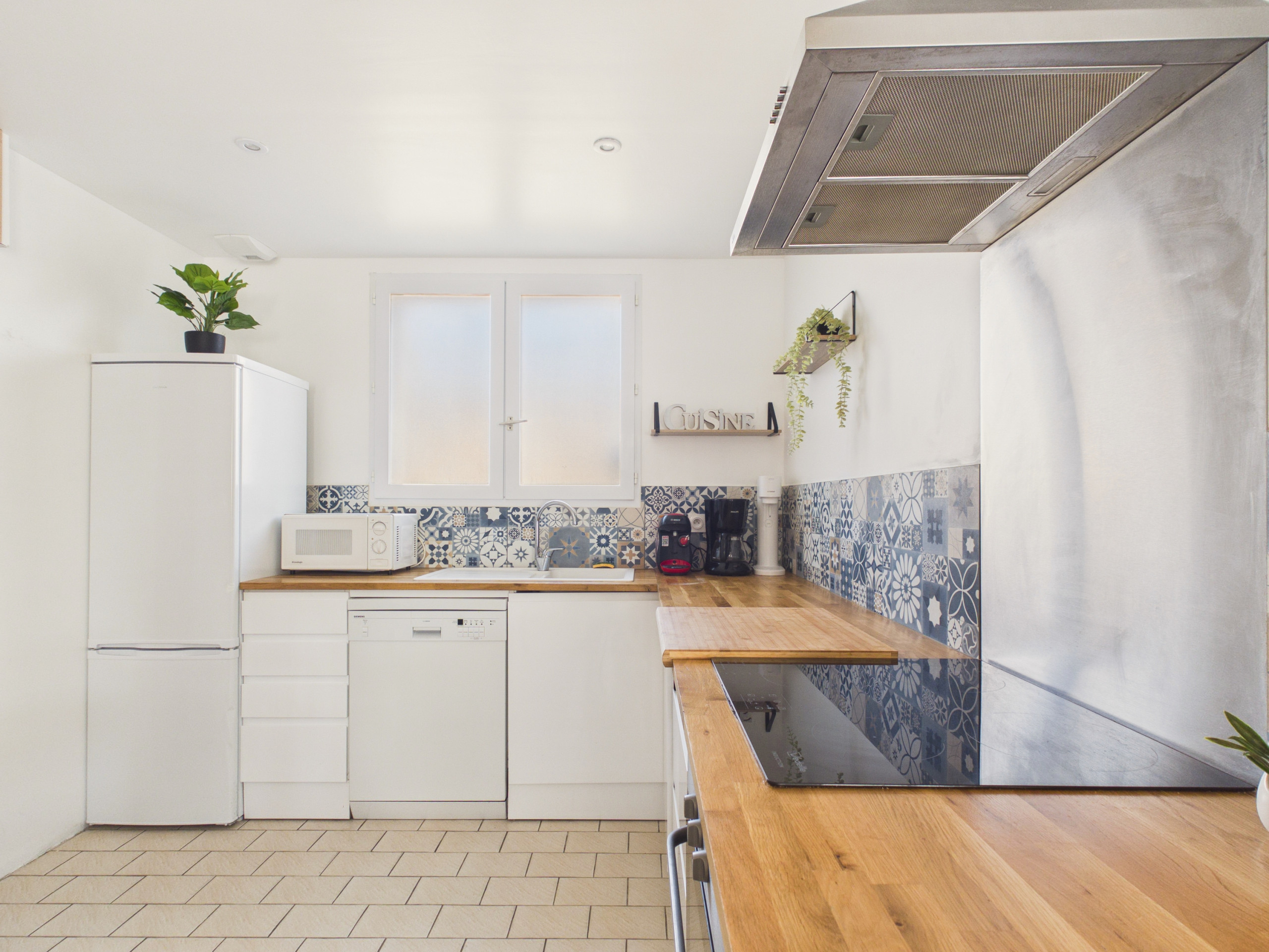 Inside, the entrance leads directly into a warm and functional living space. The lounge area, fitted with a comfortable corner sofa and a television, invites relaxation. Just next to it, the dining room has a table that can accommodate 4 people to share your meals. The open-plan, modern and practical kitchen is fully equipped: induction hobs, refrigerator, freezer, oven, microwave, dishwasher, filter coffee machine, toaster, kettle and everything necessary to cook just like at home.