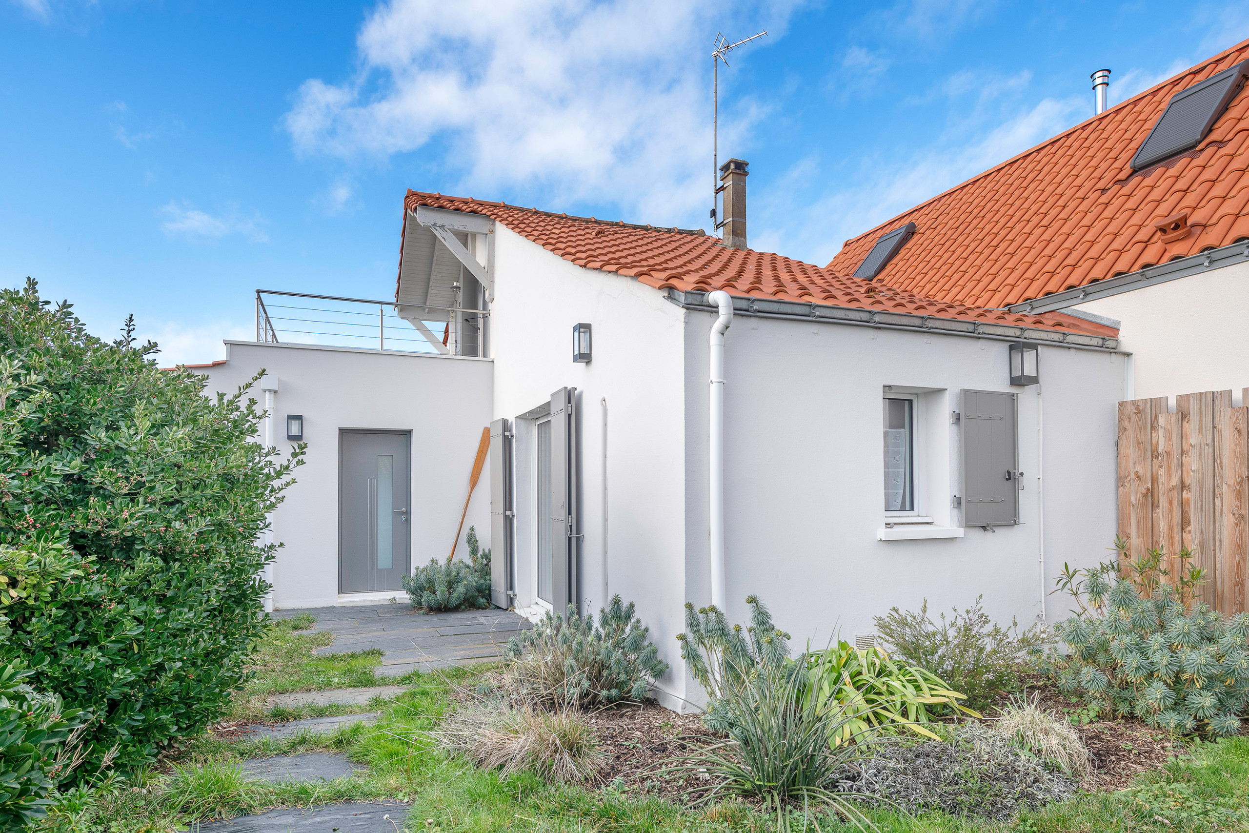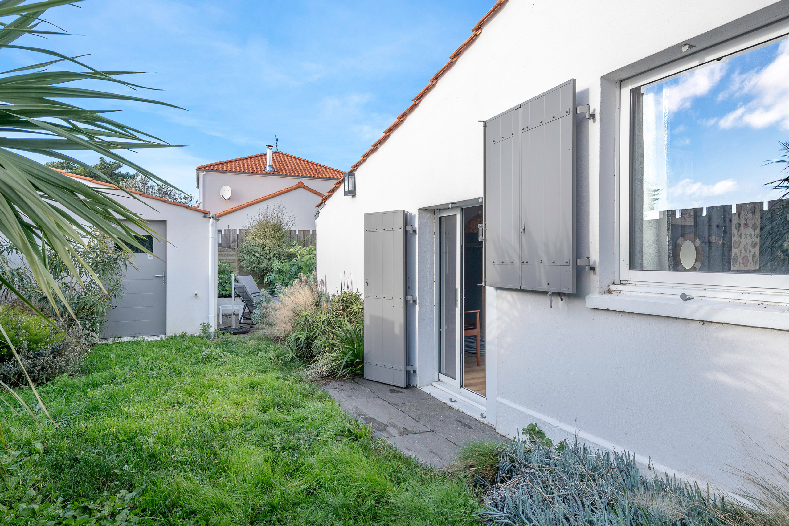 By a secure private path, you access the accommodation and its 20m² tiled terrace without overlooking neighbours, with a table, outdoor chairs, two sunbeds, a parasol, a charcoal barbecue, and an outdoor shower for your beach returns.