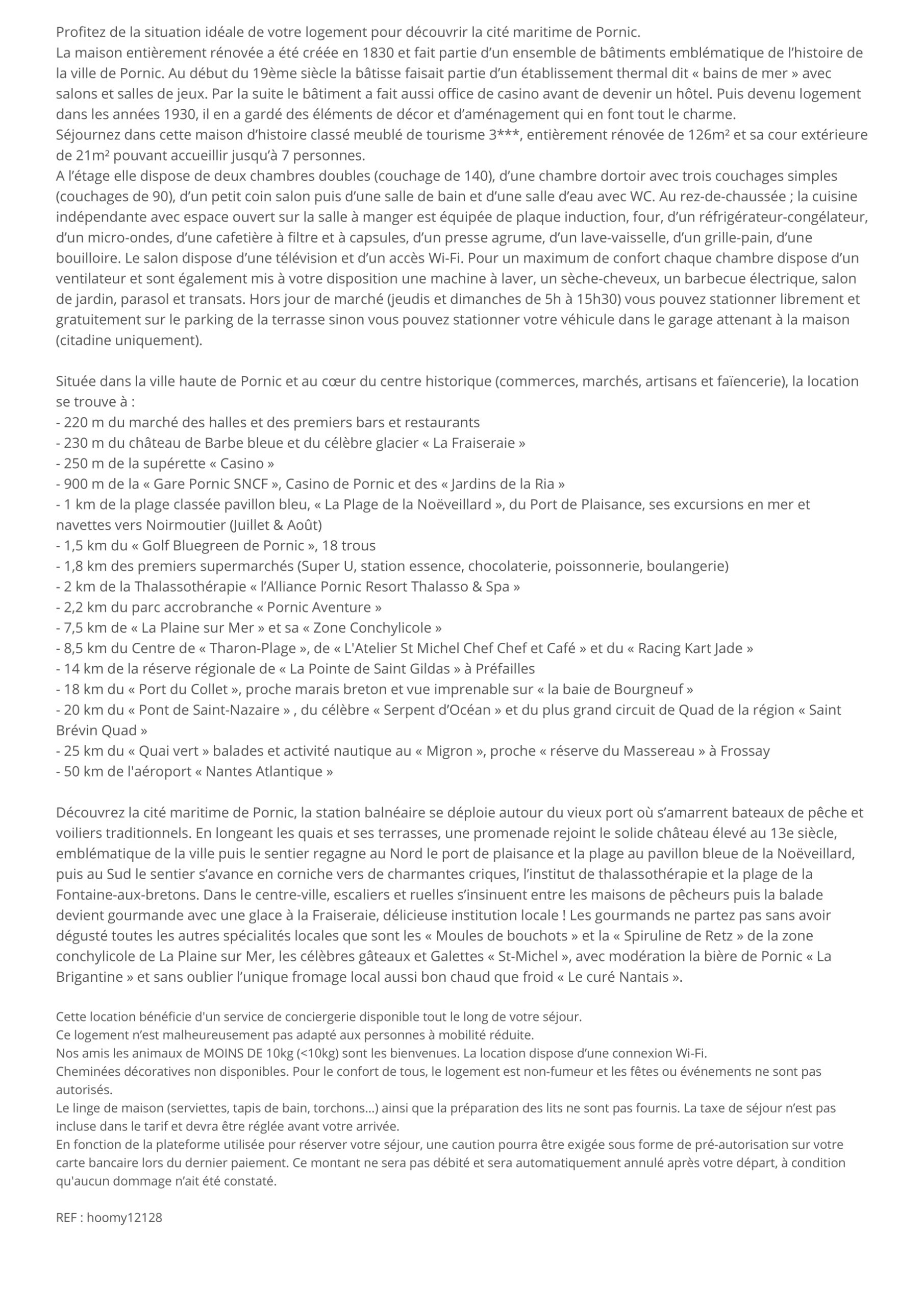 - 2 km from the Thalassotherapy "l'Alliance Pornic Resort Thalasso & Spa"