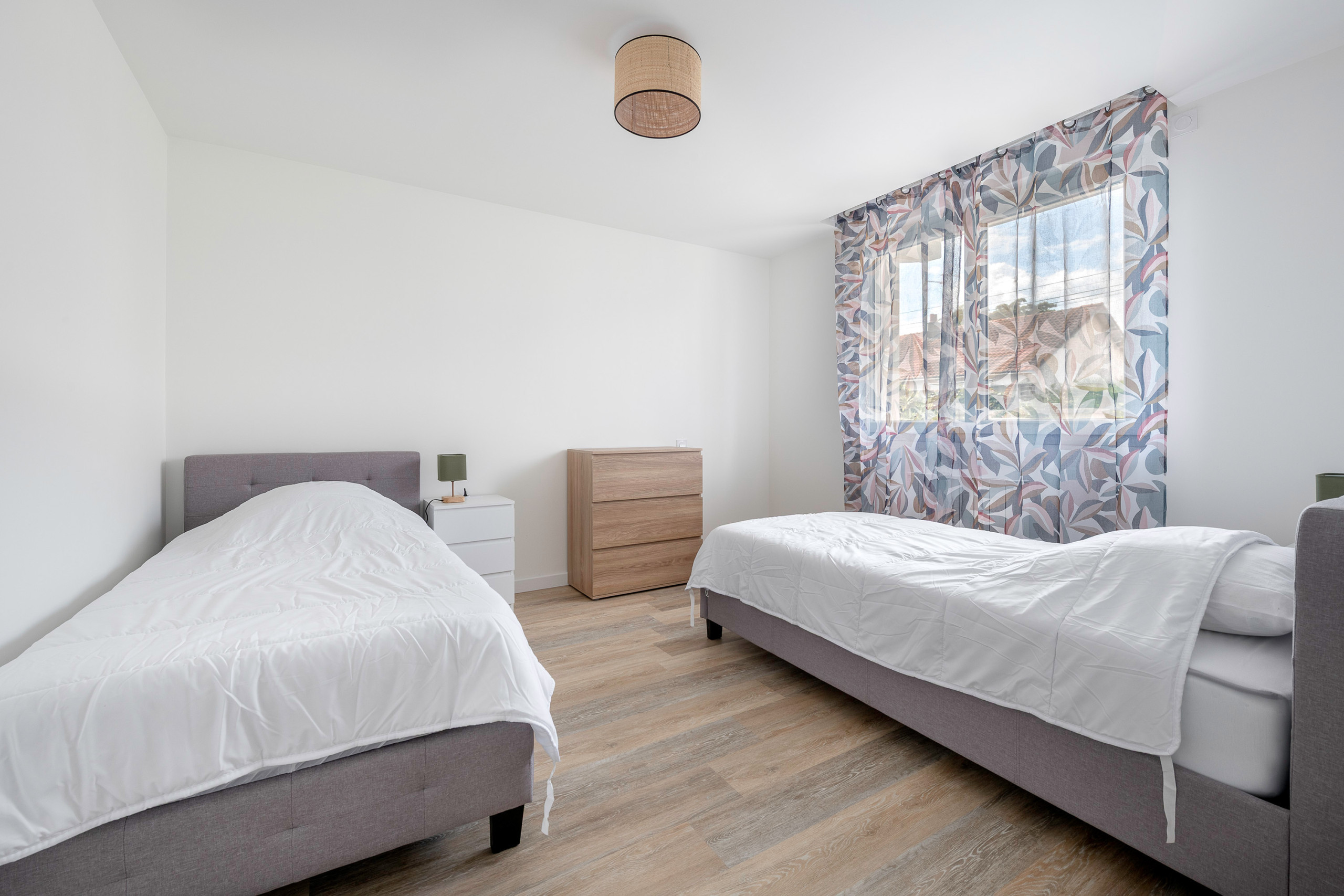 This 80m² terraced house has been completely renovated and offers single-storey living with a fenced garden and can accommodate up to 6 people. You stay in the lower part of the house which has a double bedroom with two single beds (90), a suite with a bathroom equipped with two 90 beds combinable into a 180 bed (with mattress topper), and a third bedroom with a 160 double bed.