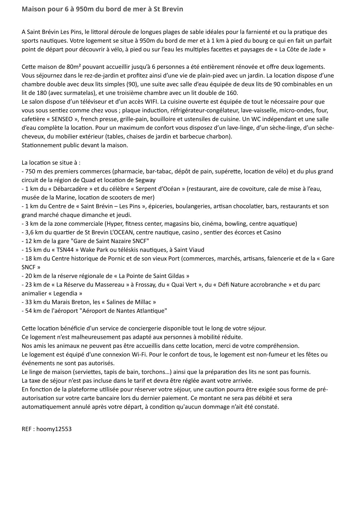 - 1 km from the "Saint Brévin – Les Pins" Centre, grocery stores, bakeries, chocolate artisan, bars, restaurants and its large market every Sunday and Thursday
