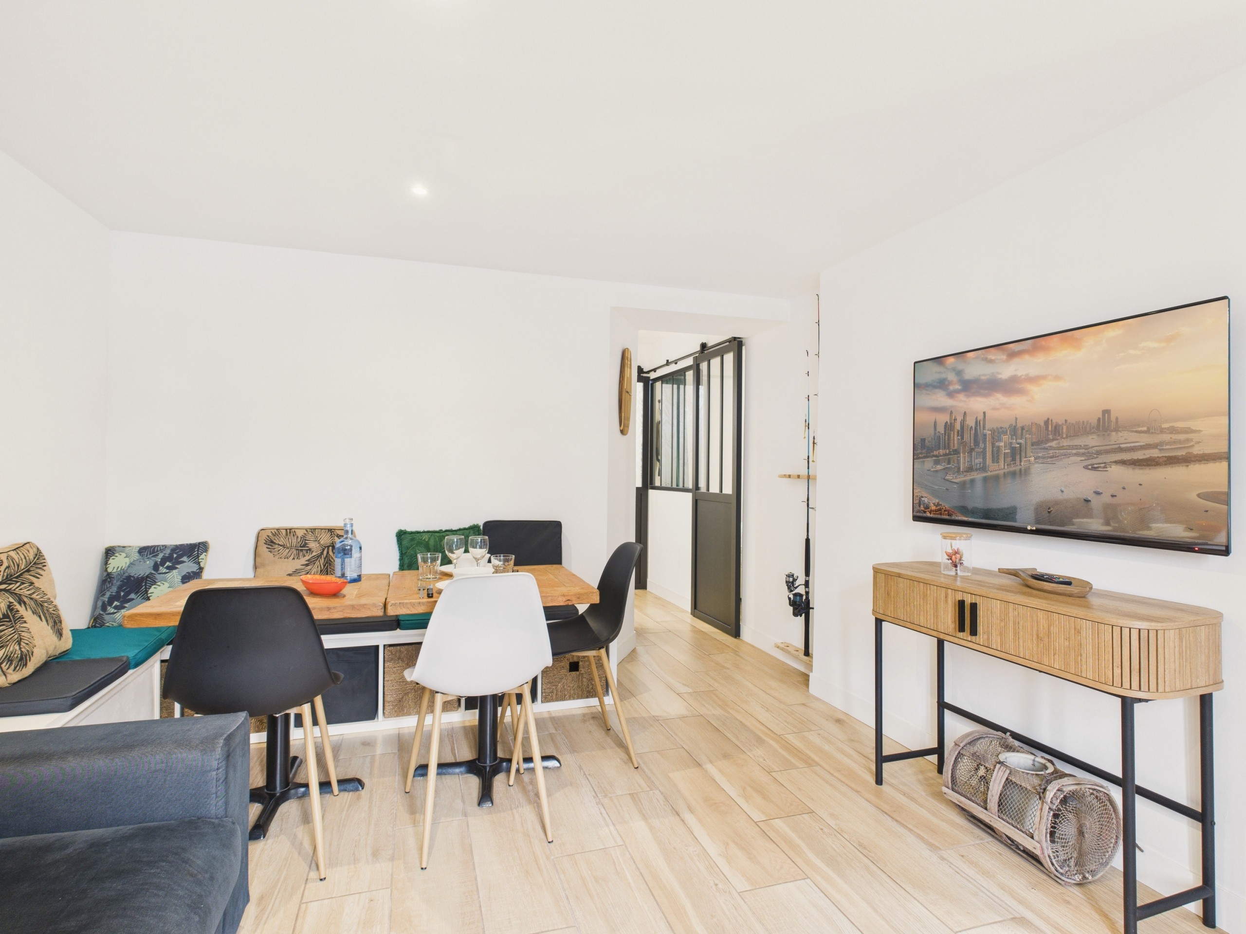 Agradable apartamento dúplex de 33 m² ubicado en el primer piso de una residencia sin ascensor con piscina que tiene un dormitorio en la planta superior y puede alojar hasta 4 personas. Cuenta con una sala de estar con balcón y muebles de jardín, una cama doble en el entresuelo y un dormitorio con dos camas individuales. La cocina americana está equipada con placas de inducción, nevera, nevera, microondas, horno, cafetera de filtro, tostadora y hervidor de agua. La piscina comunitaria (no climatizada) está disponible del 1 de junio al 30 de septiembre. Hay una plaza de aparcamiento al aire libre disponible.