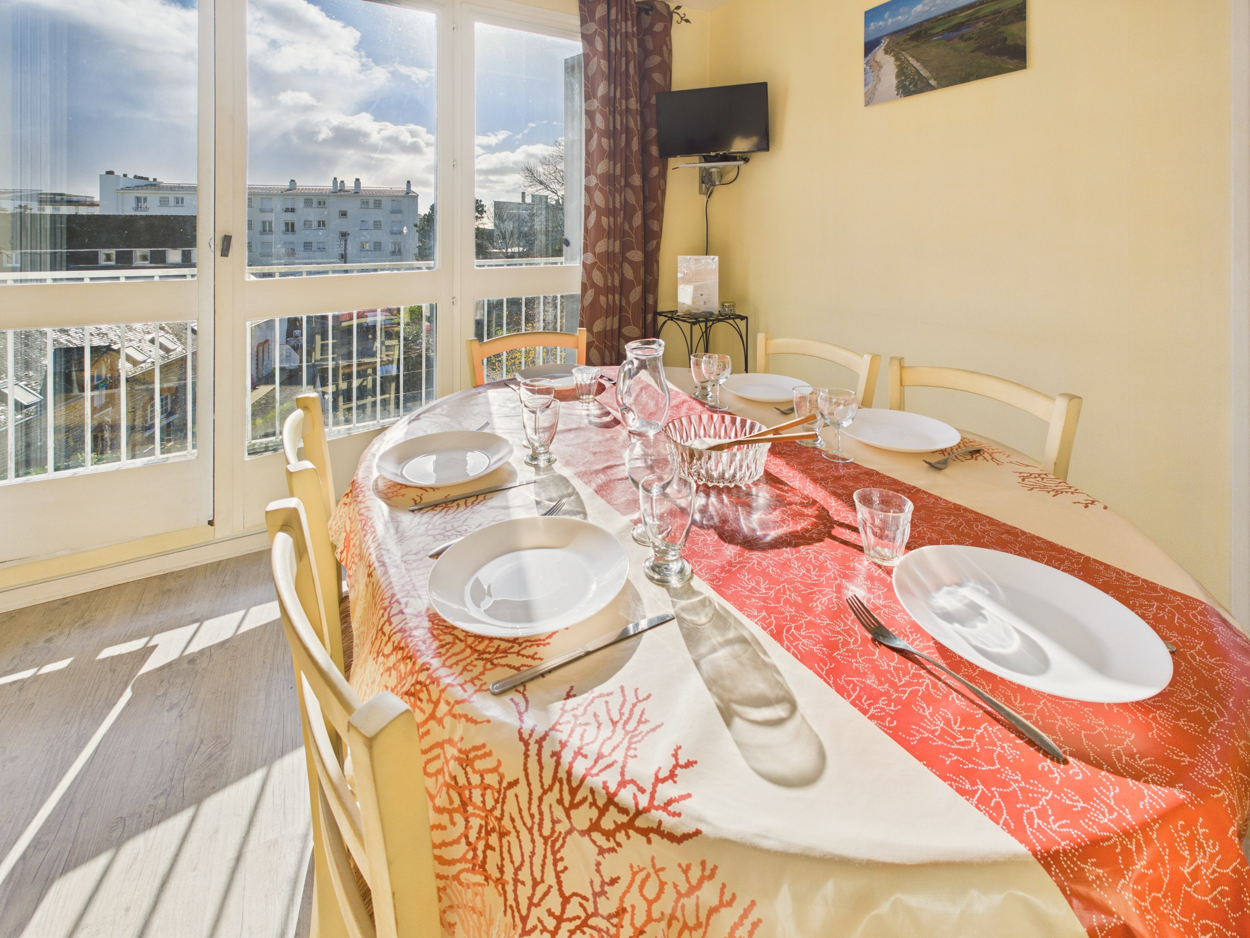 Al cruzar la puerta de entrada, descubrirá a su derecha una hermosa sala de estar compuesta por una mesa para 6 personas y un rincón de salón con sofá, televisión y acceso al balcón. A su izquierda, la cocina independiente, completamente equipada (refrigerador, congelador, horno, microondas, placas de gas), le ofrece todo lo necesario para preparar sus comidas. Para el desayuno, hervidor, tostadora y cafetera de filtro también están a su disposición.