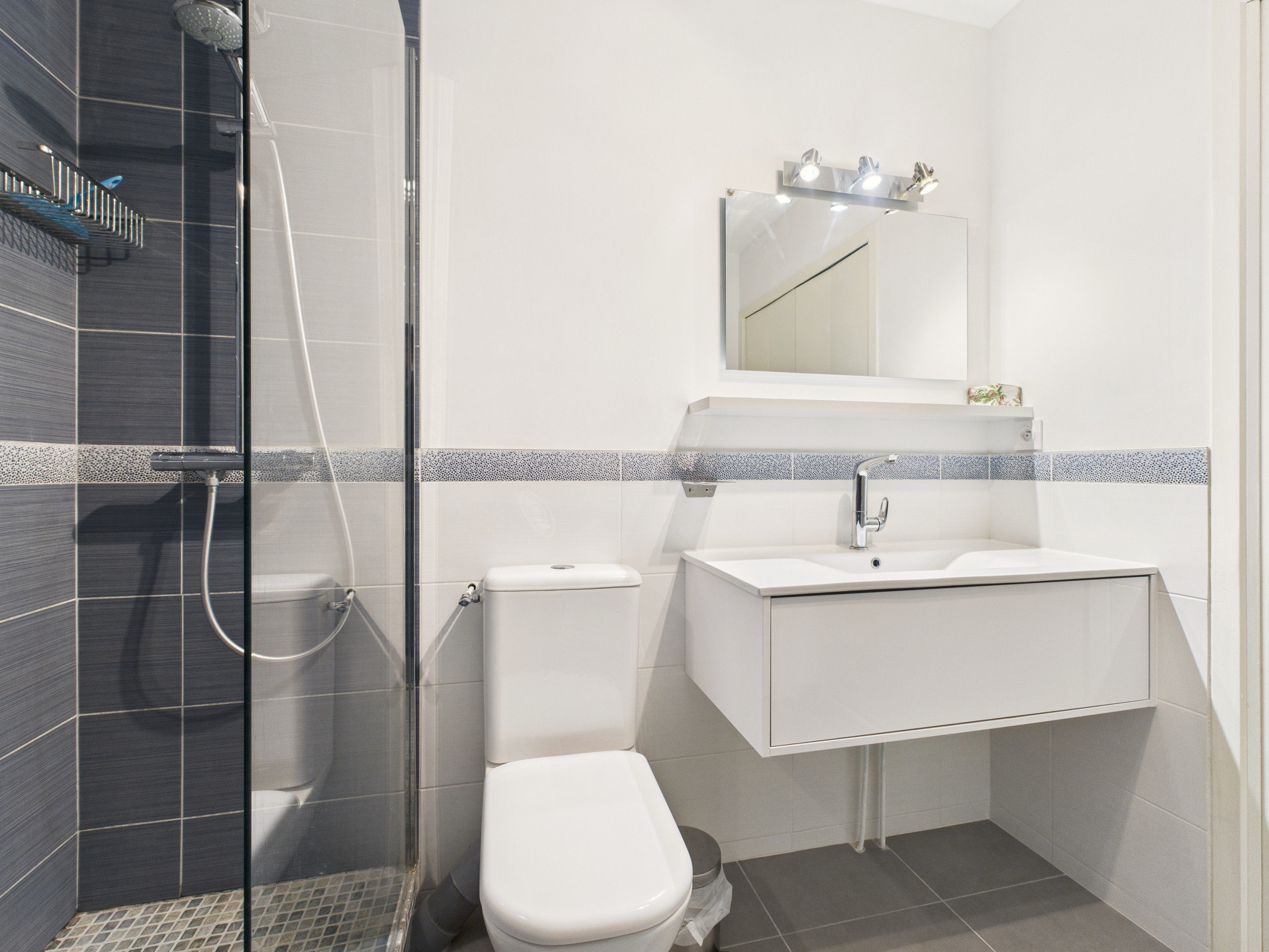 El cuarto de baño incluye un secador de pelo y un inodoro. Un segundo inodoro independiente también está presente en el apartamento.