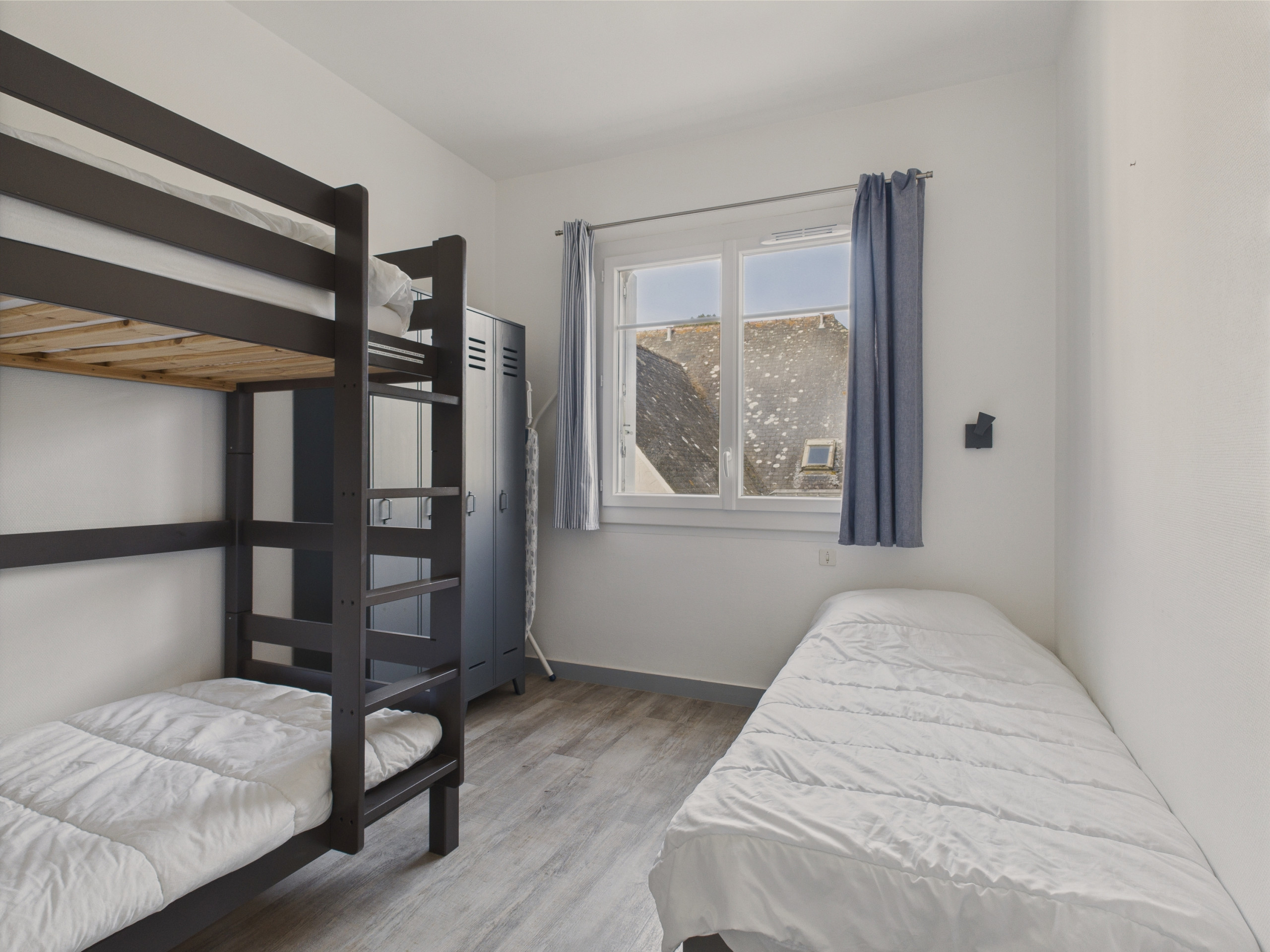 La zona de noche consta de dos habitaciones. La primera, separada del salón por una cortina, cuenta con una cama doble (140x190 cm), acceso directo al balcón y al cuarto de baño. La segunda habitación está equipada con una cama individual (90x190 cm), una litera (90x190 cm) y un armario de almacenamiento.