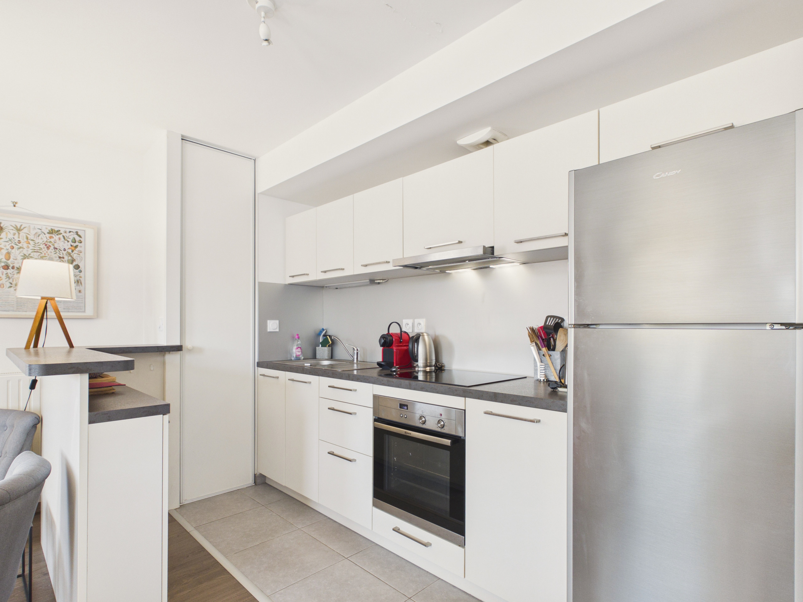 Cruce la puerta de entrada y déjese seducir por un espacio funcional y acogedor. Descubrirá primero el rincón de la cocina, completamente equipado (refrigerador, congelador, horno, microondas), con todo lo necesario para cocinar como en casa. Para comenzar bien el día, una cafetera de filtro, una hervidor de agua y una tostadora también están a su disposición.