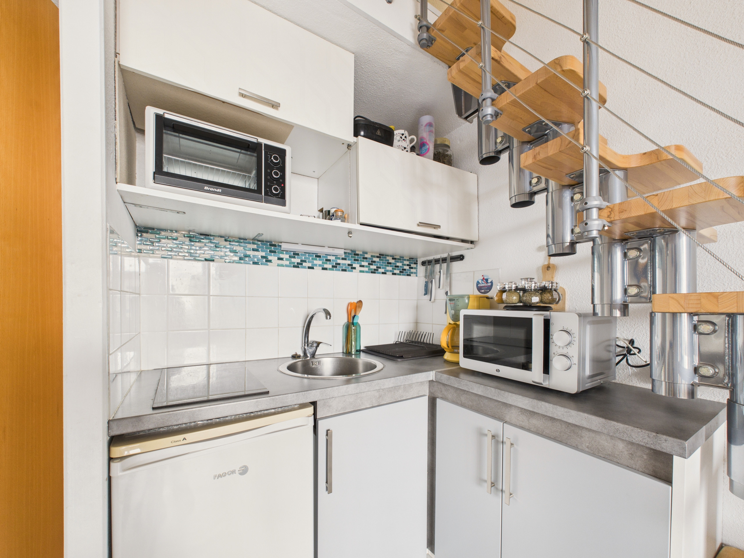 Pase por la puerta de entrada y déjese seducir por un espacio funcional y acogedor. Descubrirá primero el rincón de la cocina, completamente equipado (refrigerador, congelador, horno, microondas), con todo lo necesario para cocinar como en casa. Para comenzar bien el día, una cafetera de filtro, una hervidor de agua y una tostadora también están a su disposición.