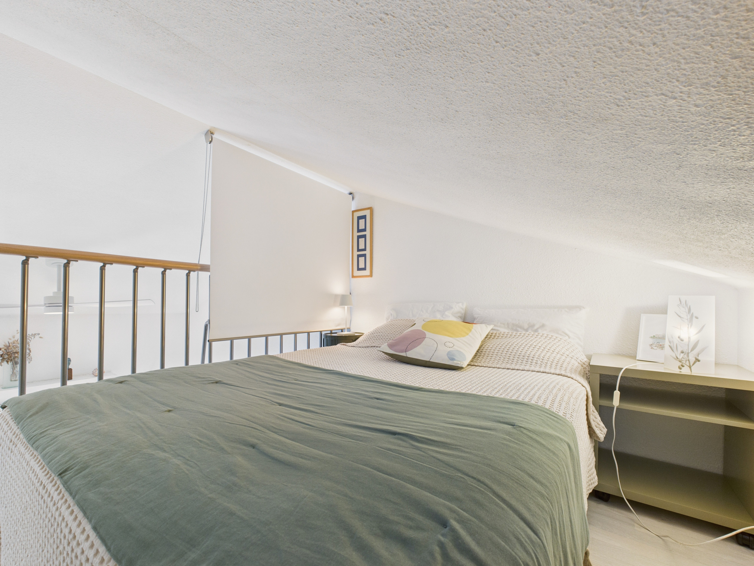 Descubrirás una habitación con una cama individual (85/185) y en el altillo accederás al segundo lugar para dormir que es una cama doble (140/190)