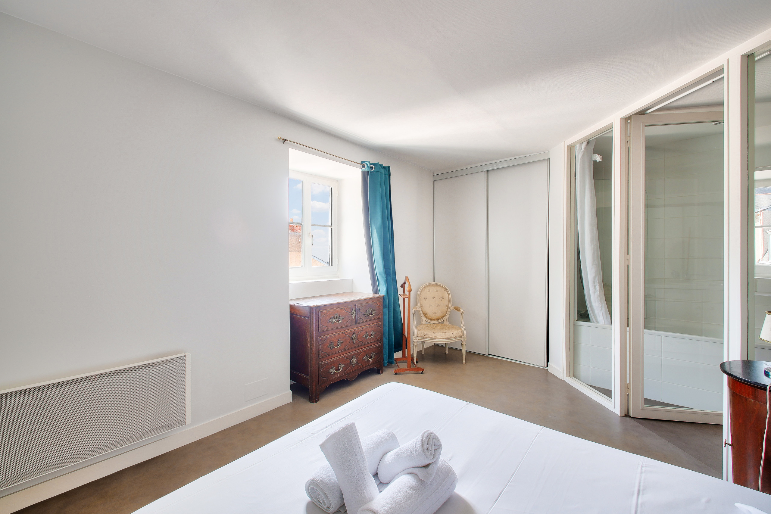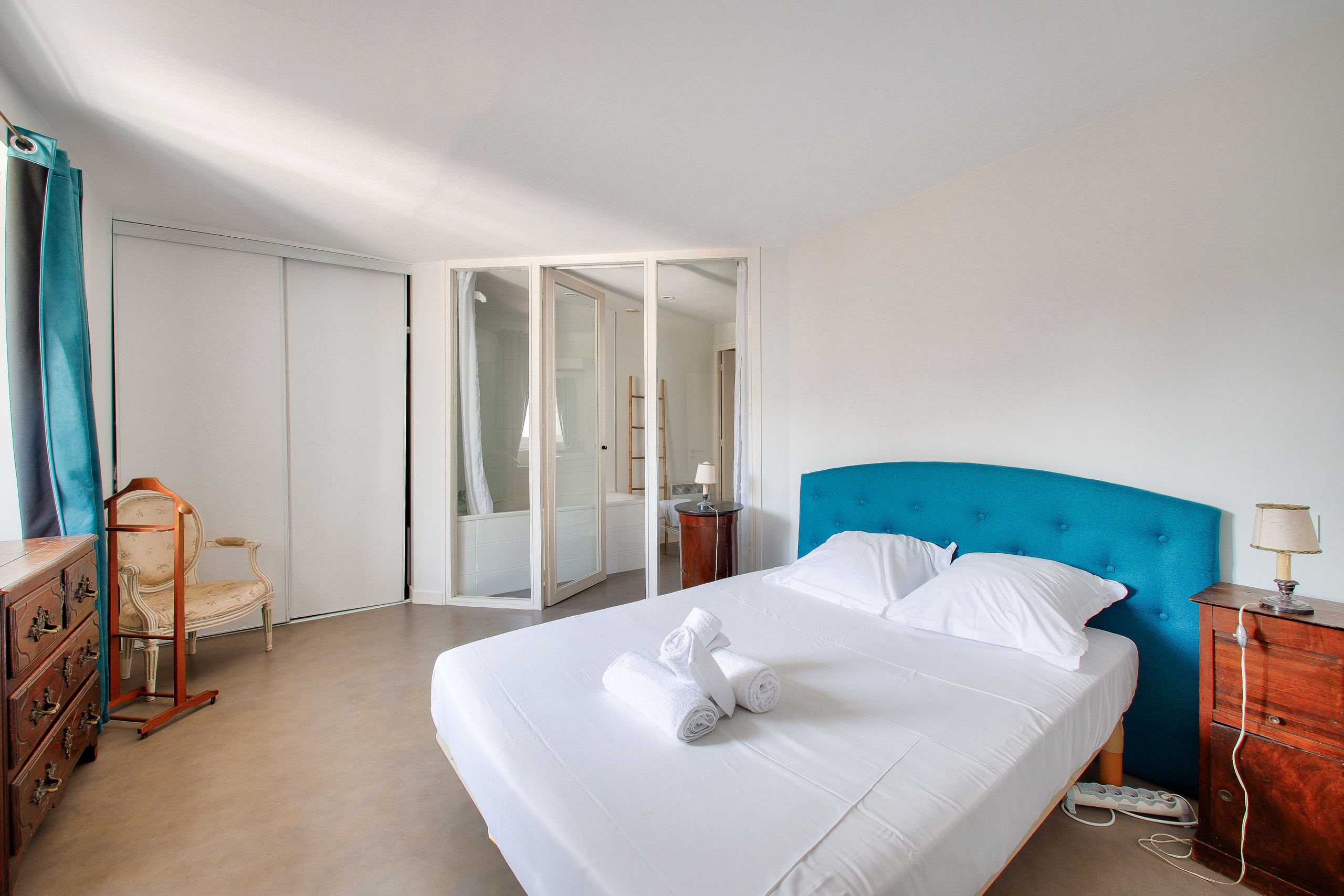 El apartamento cuenta con una suite principal con una cama Queen Size grande (160/200), un baño adjunto con bañera, y un aseo independiente.