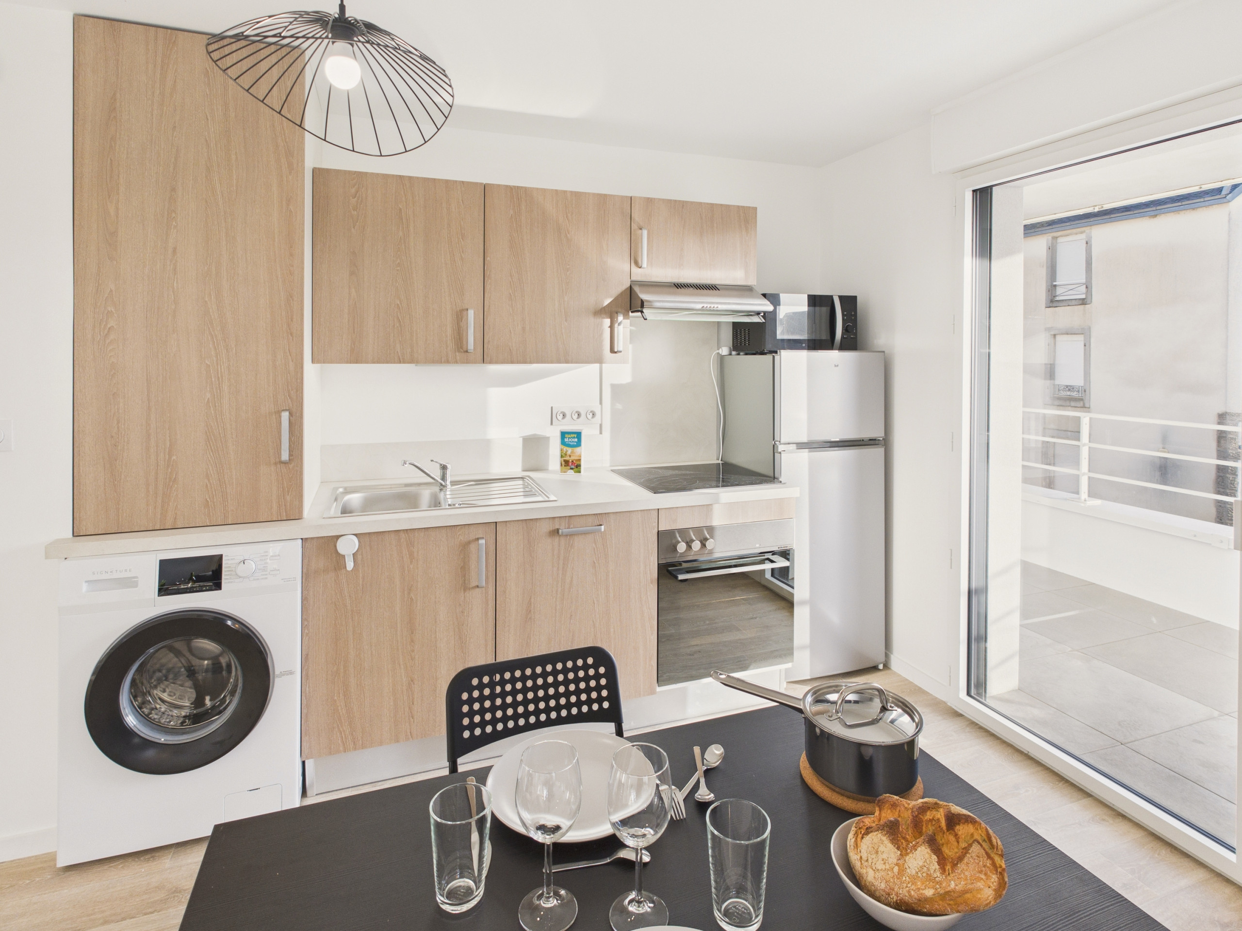 Pase por la puerta de entrada y descubra una bonita sala de estar que da acceso al balcón. La cocina abierta está completamente equipada con refrigerador, horno, microondas y placas de inducción, ofreciéndole todo lo necesario para preparar sus comidas. Para el desayuno, una hervidor de agua, una tostadora y una cafetera de filtro también están a su disposición. Comparta sus comidas alrededor de la mesa del salón o prefiera la del balcón durante el verano. Por la noche, disfrute del sofá y la televisión para descansar.